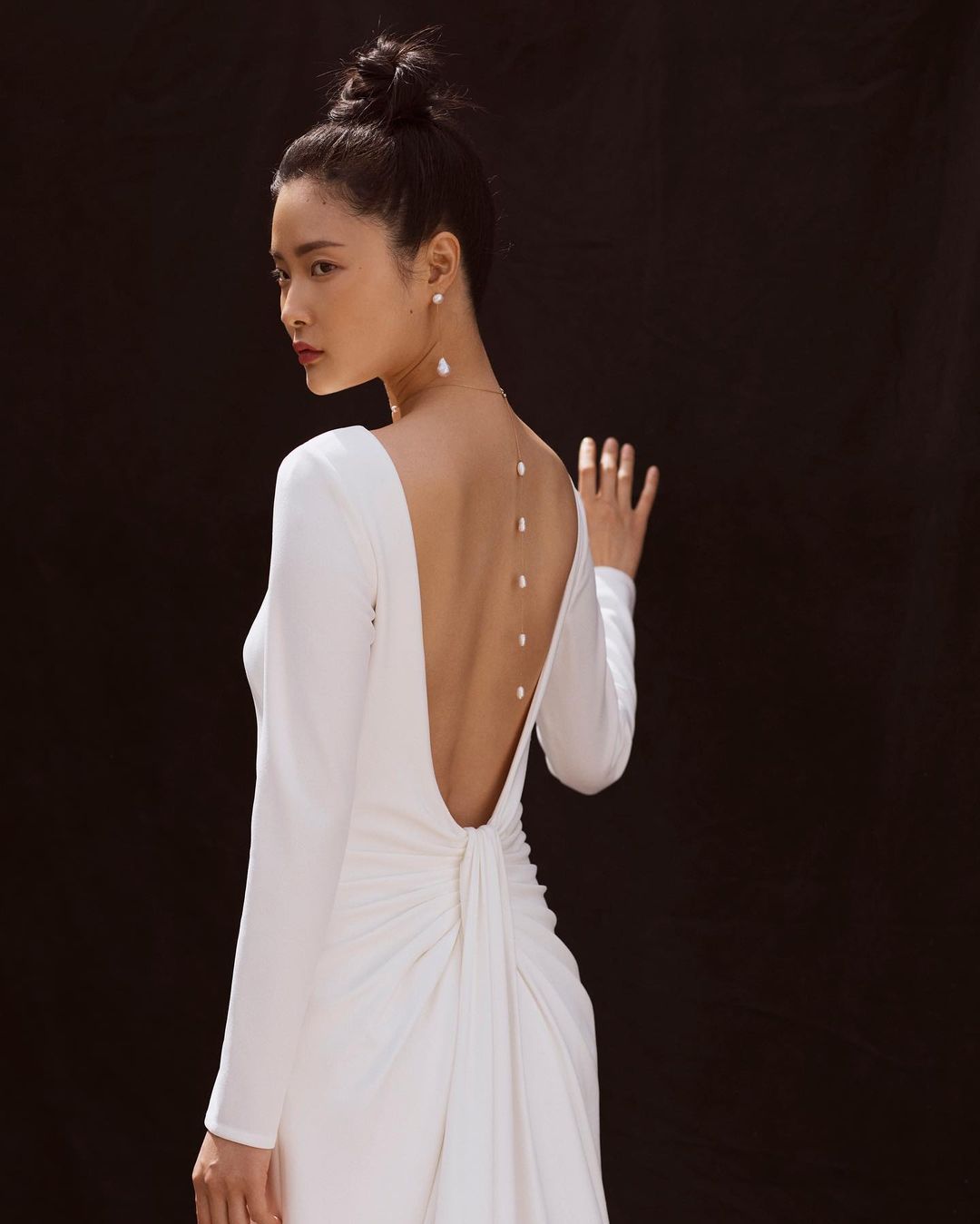 This clean crepe gown is perfect for the minimalist bride, featuring long sleeves and a flawlessly fitted silhouette. A daring open back and draped train combine to make a sleek statement. By Tadashi Shoji.