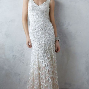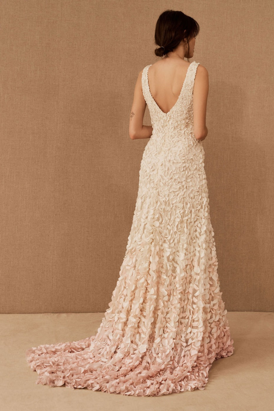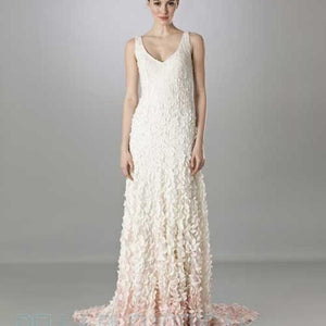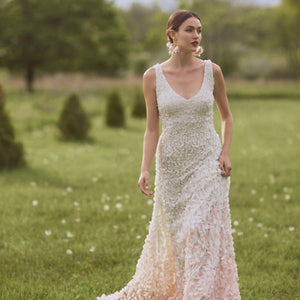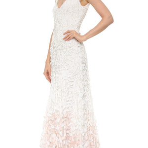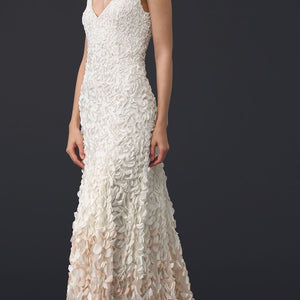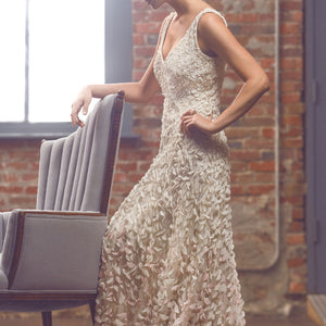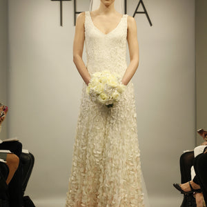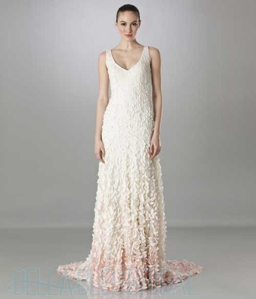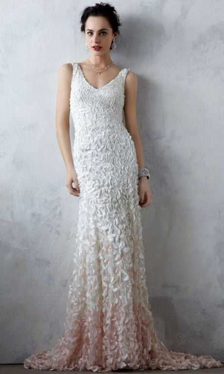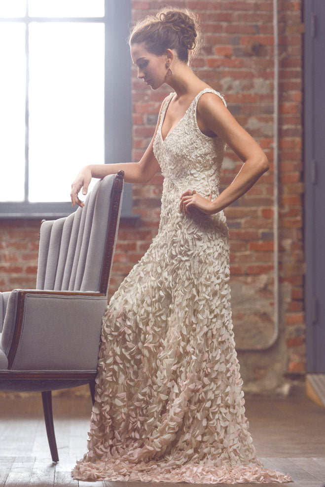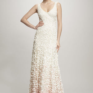 Inspired by the blossoms of the Japanese cherry tree, each intricate lasercut petal is hand-appliqued with a glass bead to airy tulle. The pale gradient creates graceful, organic movement throughout this stunning gown. By Theia Bridal. Back zip and hook-and-eye closure.