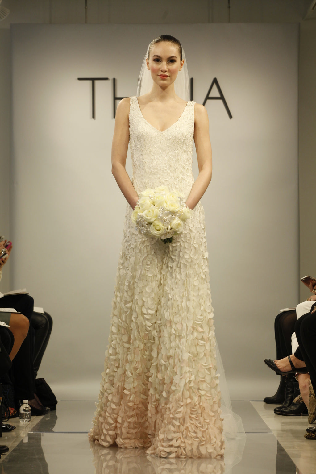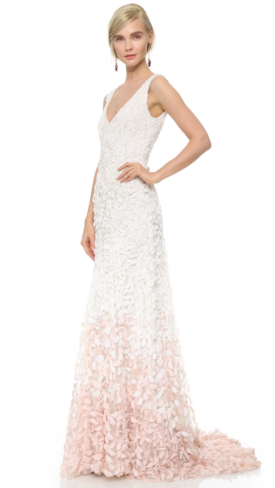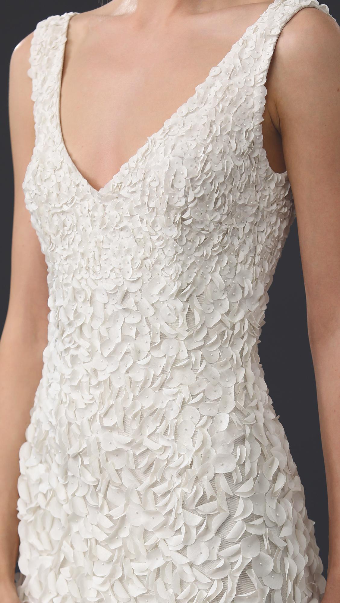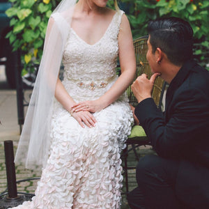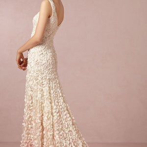 Inspired by the blossoms of the Japanese cherry tree, each intricate lasercut petal is hand-appliqued with a glass bead to airy tulle. The pale gradient creates graceful, organic movement throughout this stunning gown. By Theia Bridal. Back zip and hook-and-eye closure.