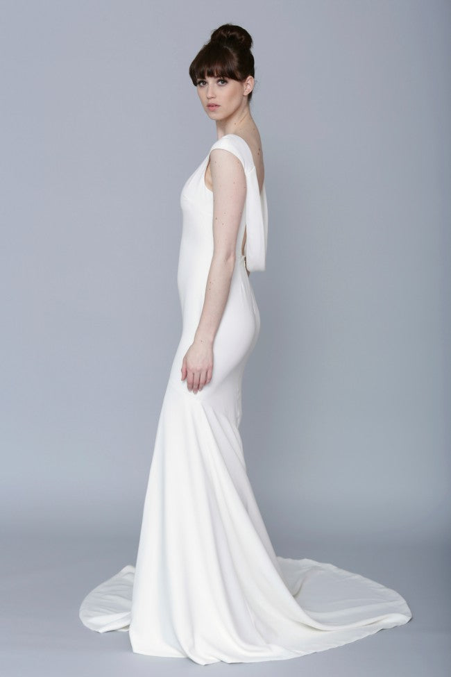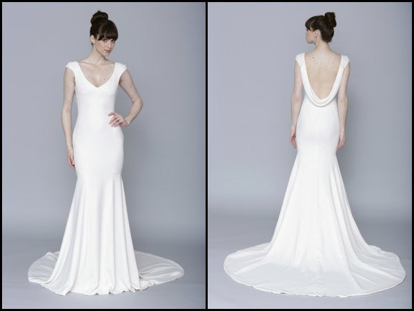 We promise this sophisticated velvet column gown, with its draped, low cowl back and stunning train, will turn heads. Perfect for an elegant fête. An exquisite Theia gown with simple, yet classic appeal. A deep cowl back reveals a peek of skin, and the long train offers a graceful, yet dramatic finish.