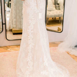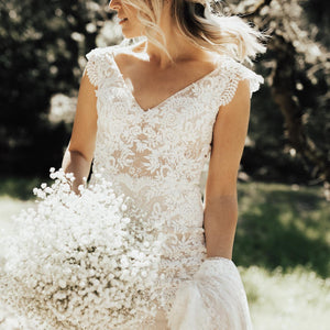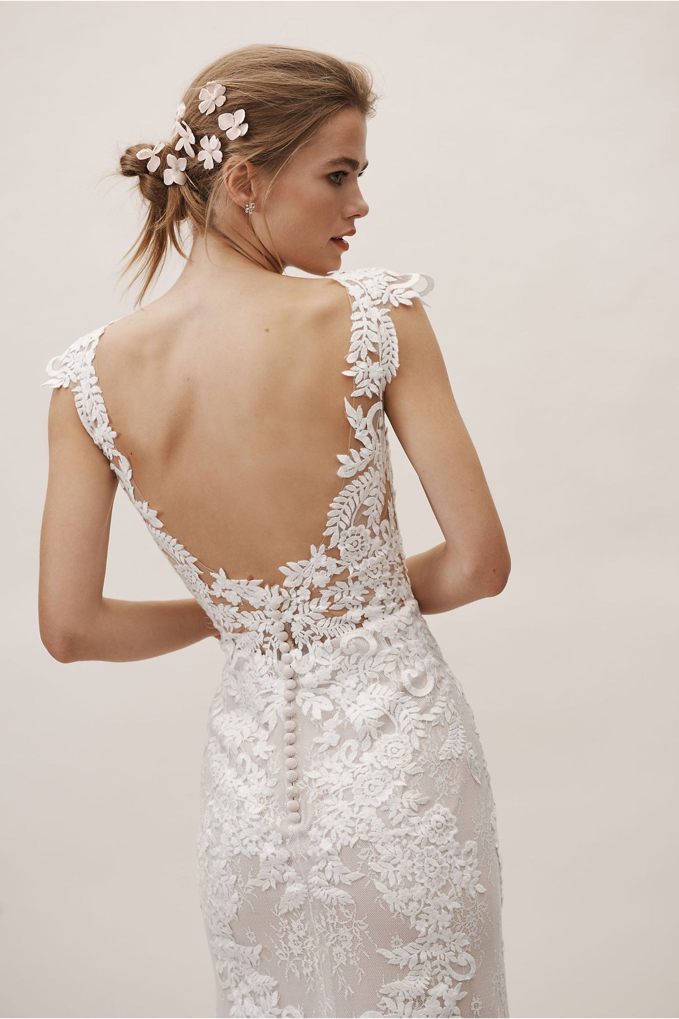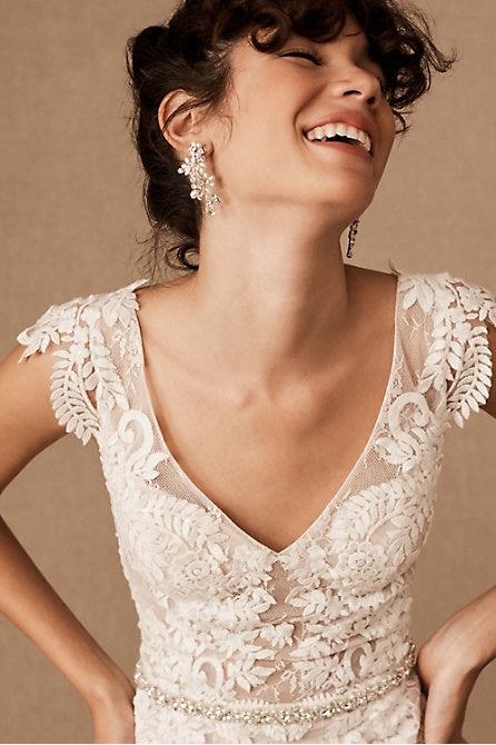 Soft lace is swathed in ivory floral embroidery, perfectly placed to highlight your best assets. The v-neckline and delicate flutter sleeves give way to a sexy open back, while a frothy train completes the look. By Whispers & Echoes.