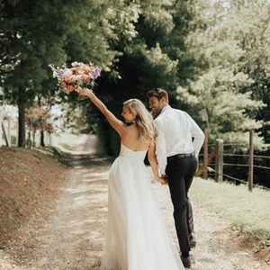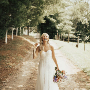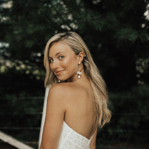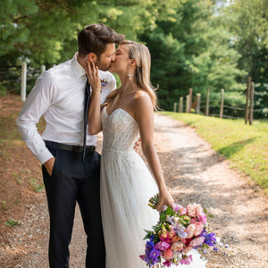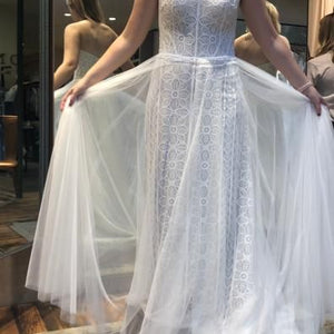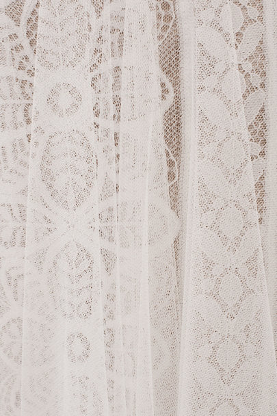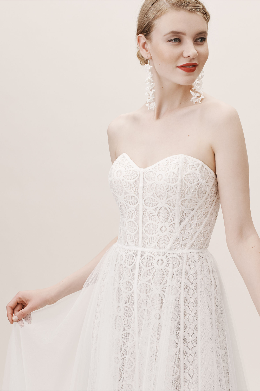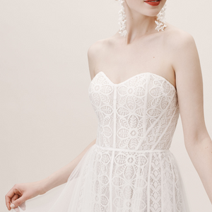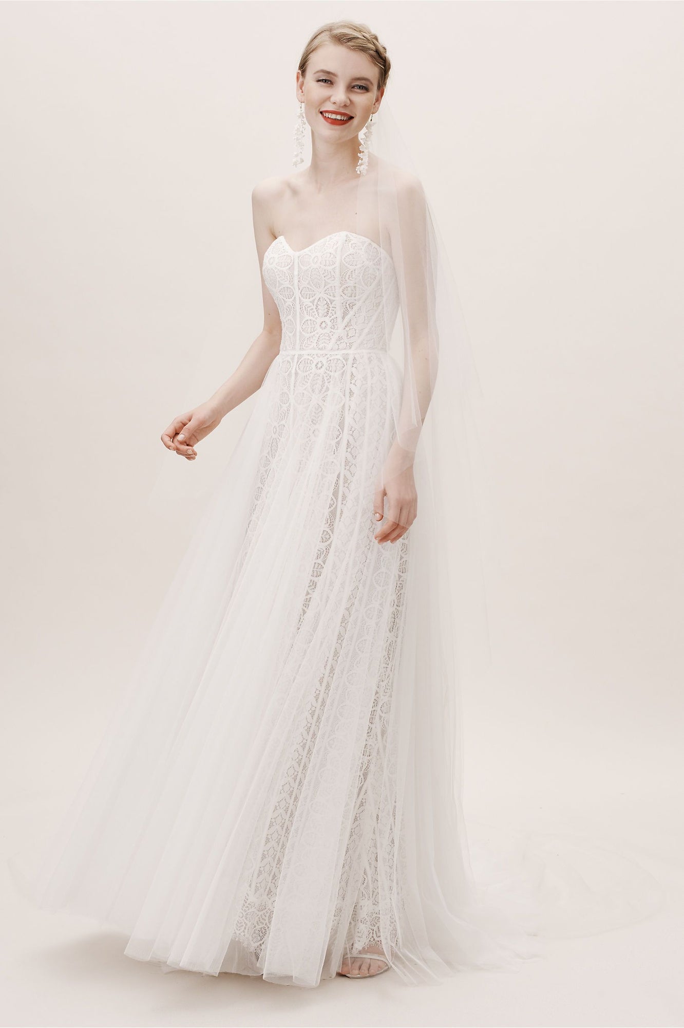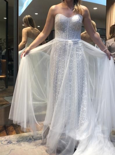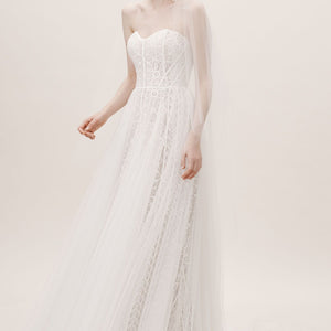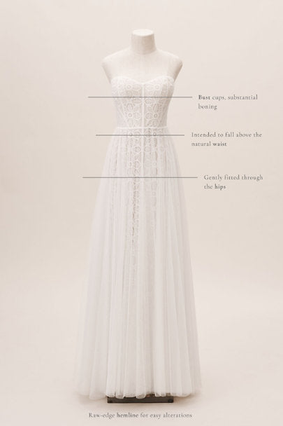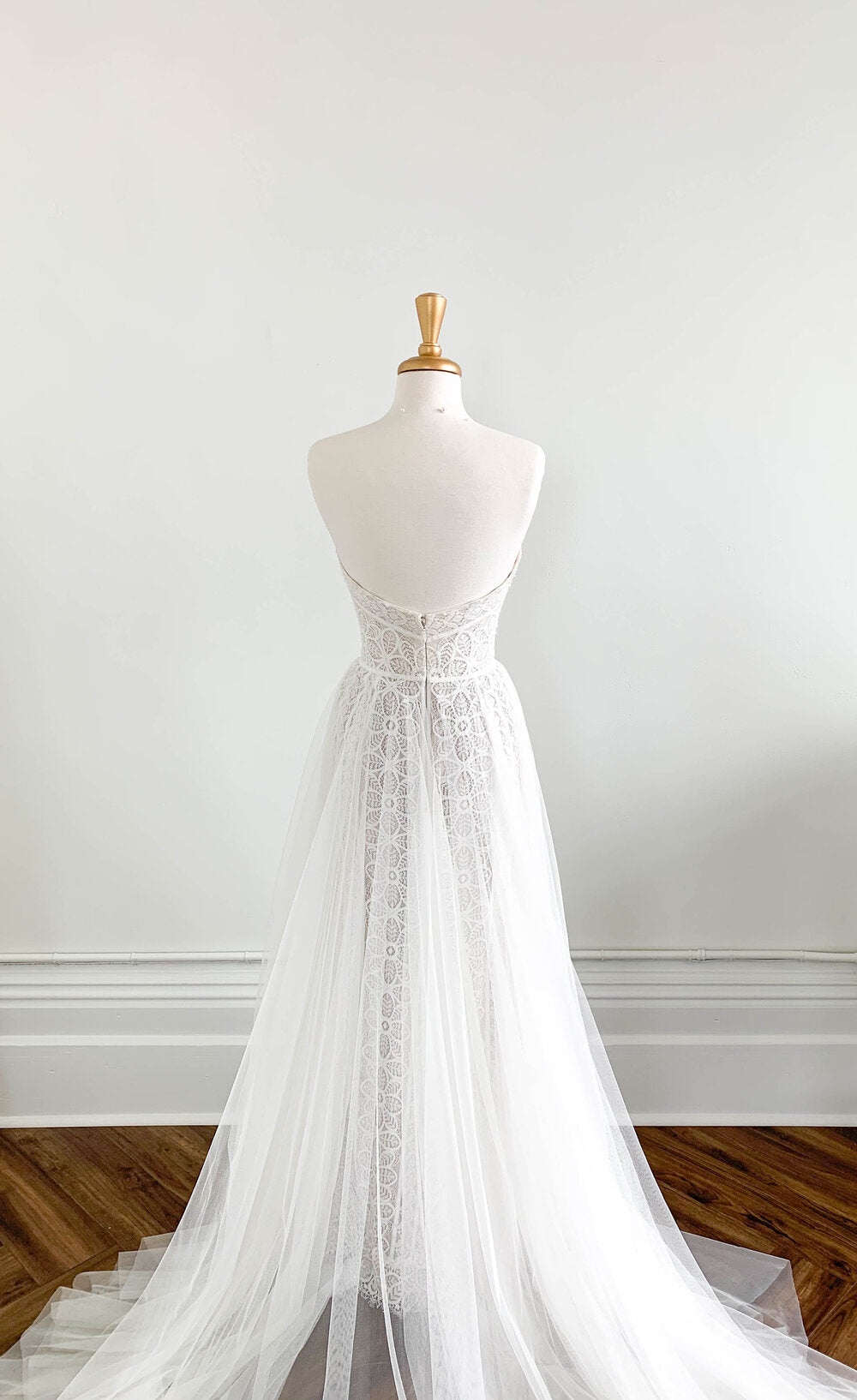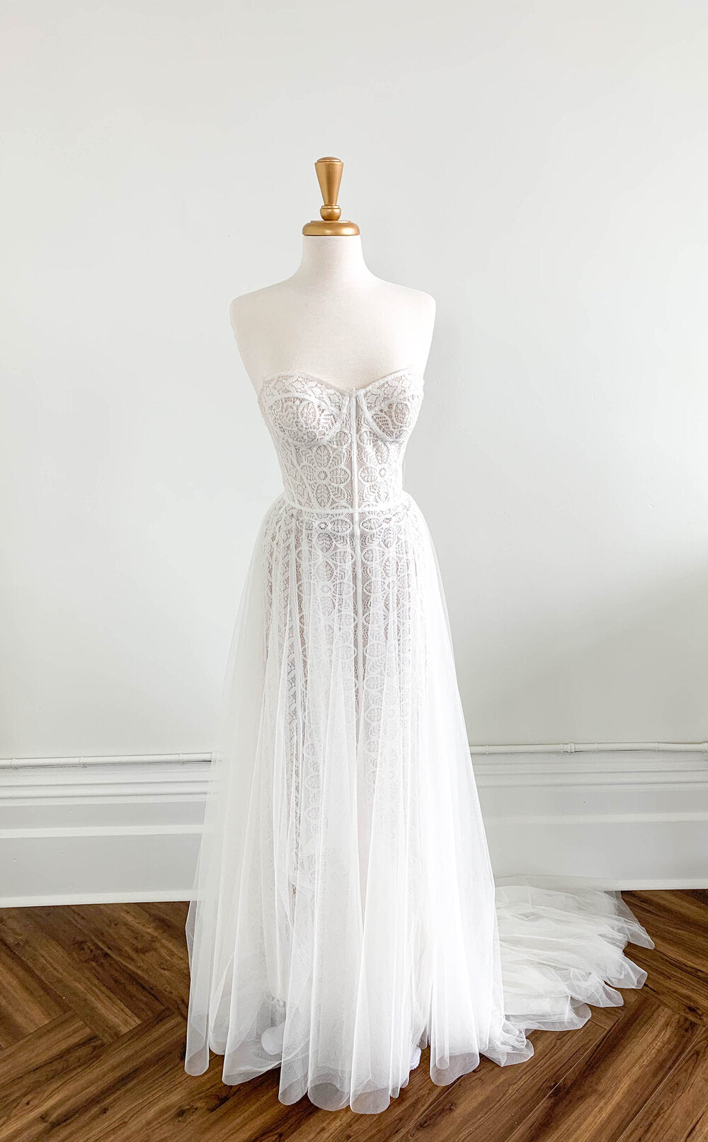 A fitted column of graphic, bohemian lace forms the foundation of this strapless gown with a structured bodice. A tulle overlay skirt shows a just peek of the lace below while creating an A-line silhouette with gorgeously airy movement.  By Willowby by Watters.
