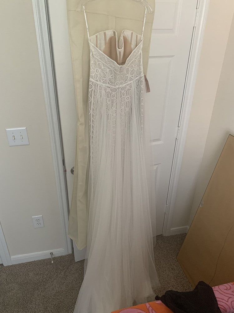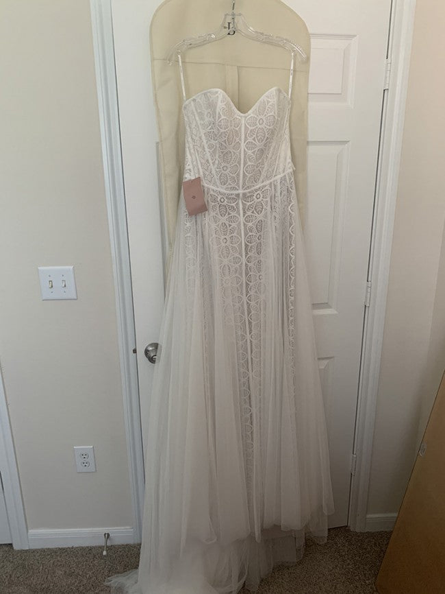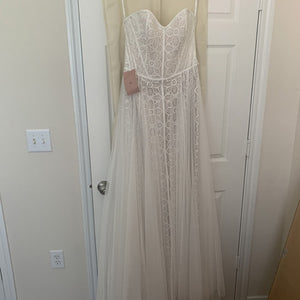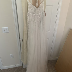 Size 12 & 14.  This gown has been tried on in store, but in very good condition.  Very minor dust/wear along the hemline.  This is usually not an issue since most brides need to shorten the dress.  Retail price: $1,395.