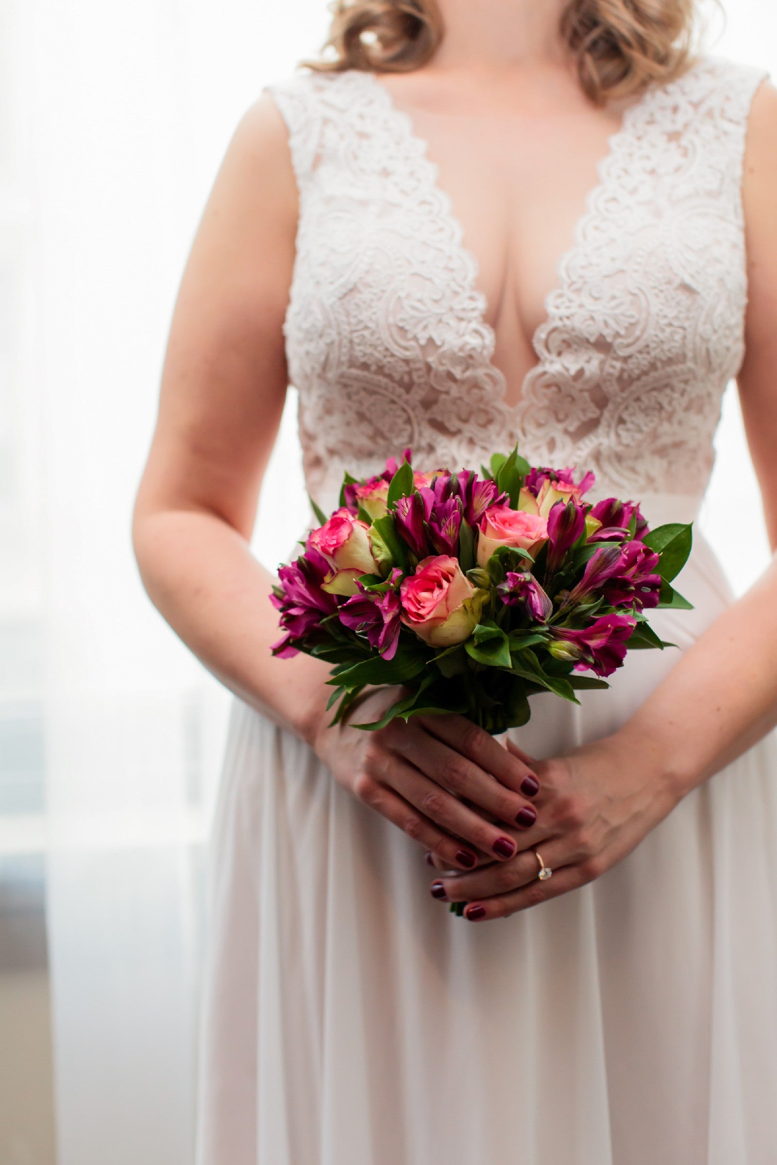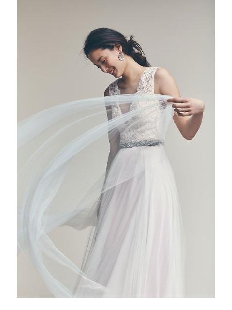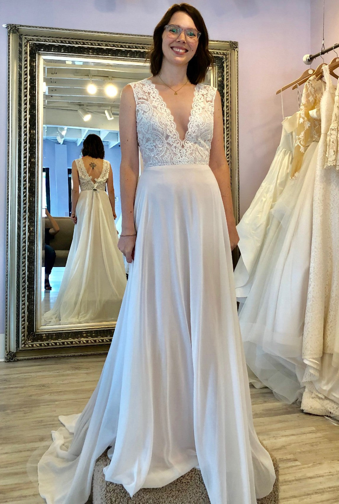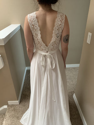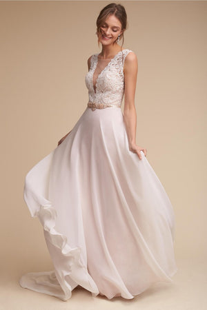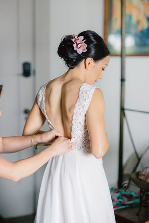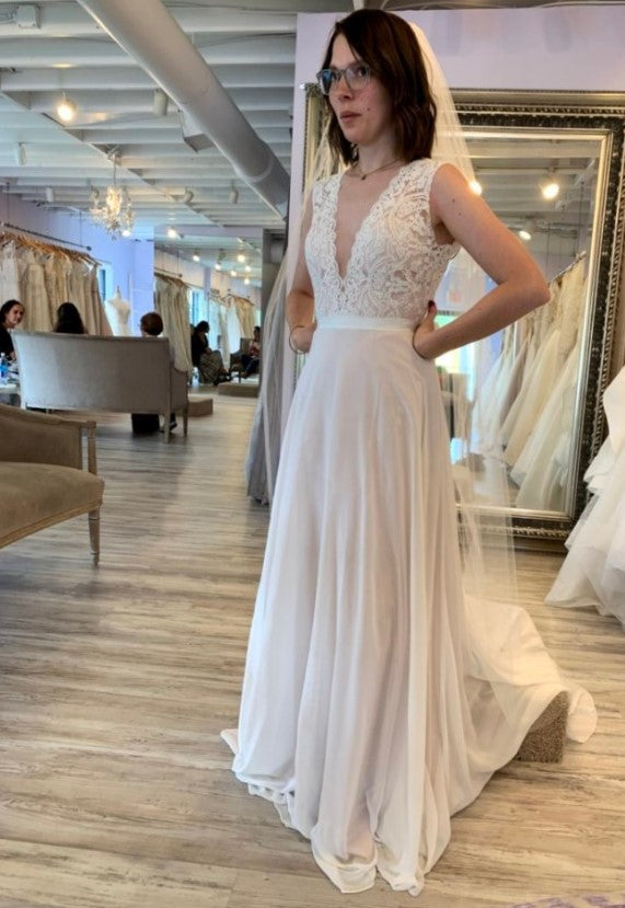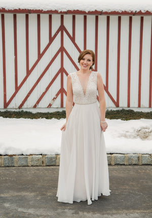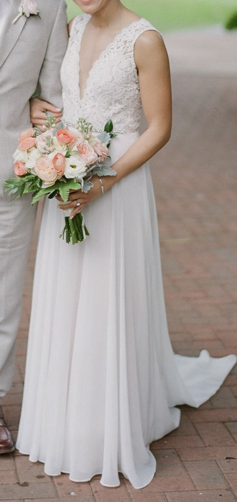 Delicate lace traverses the bodice of this romantic gown, framing a dramatic v-neck and back. Blush lining peeks out from beneath for an illusory effect while a soft ivory chiffon skirt brings cloud-like movement.
