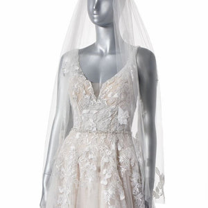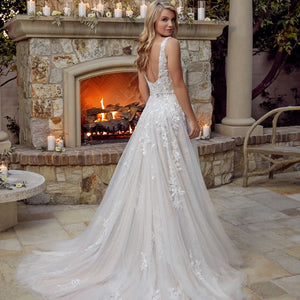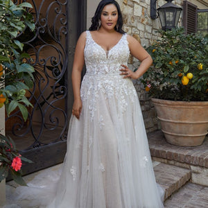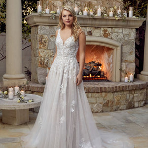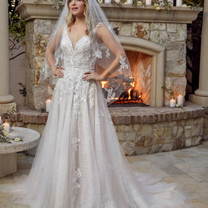 For the classic boho bride, Style 2445 is dreamy as can be. This wedding dress will have you floating down the aisle effortlessly in light layers of Chantilly lace and tulle. Beaded floral lace appliqués cover the entire bodice in glittering detail, cascading partway down the lightweight skirt with a 68 inch train. A V-neckline and matching V-back create a flawless frame, accentuated by a detachable sash at the natural waist to emphasize the A-line shape of the gown.
