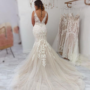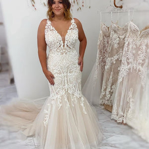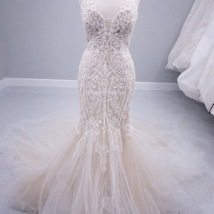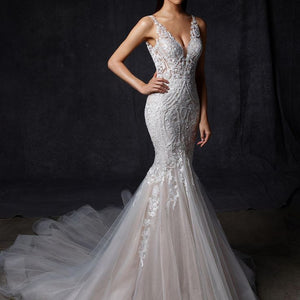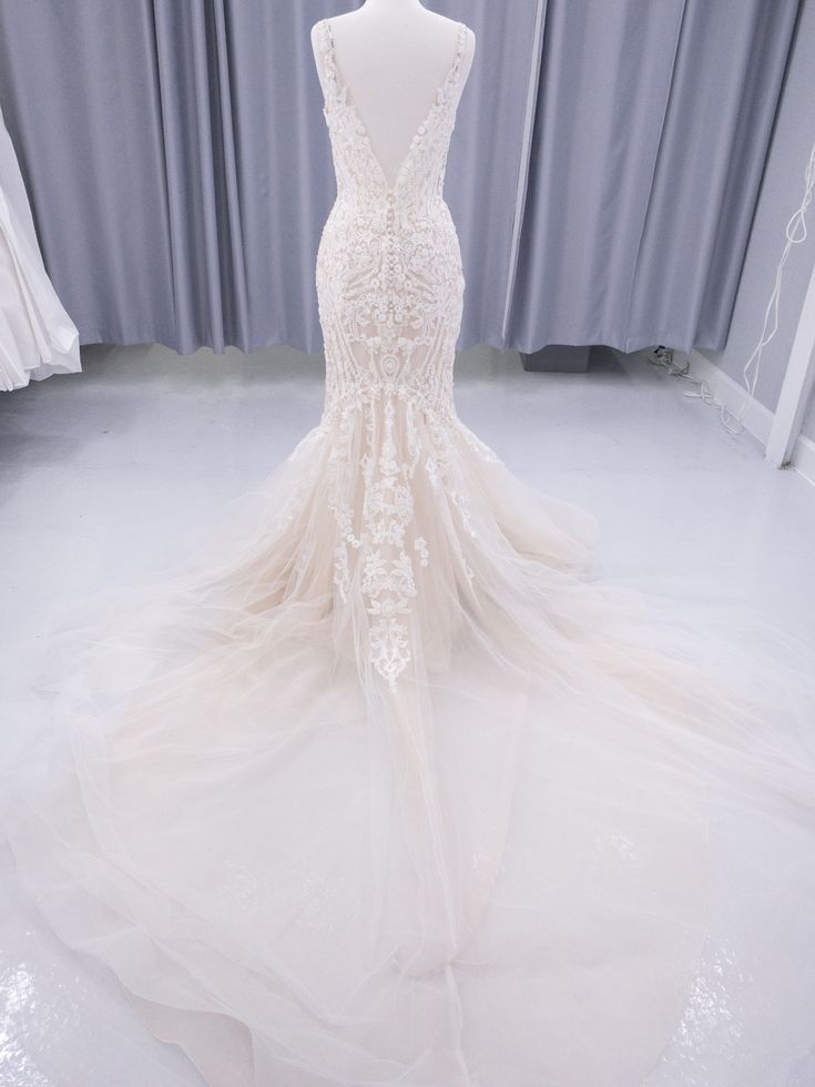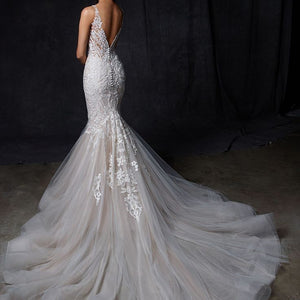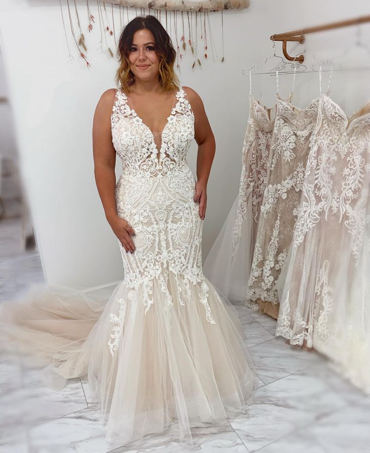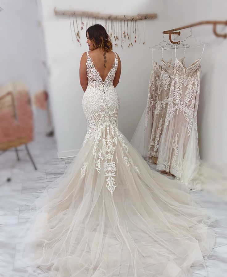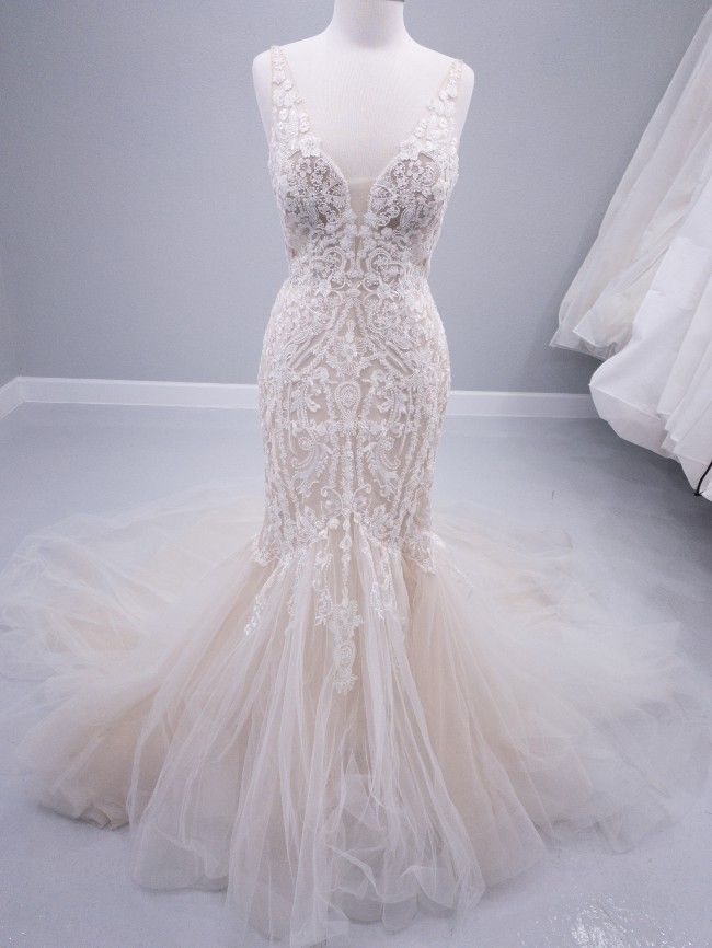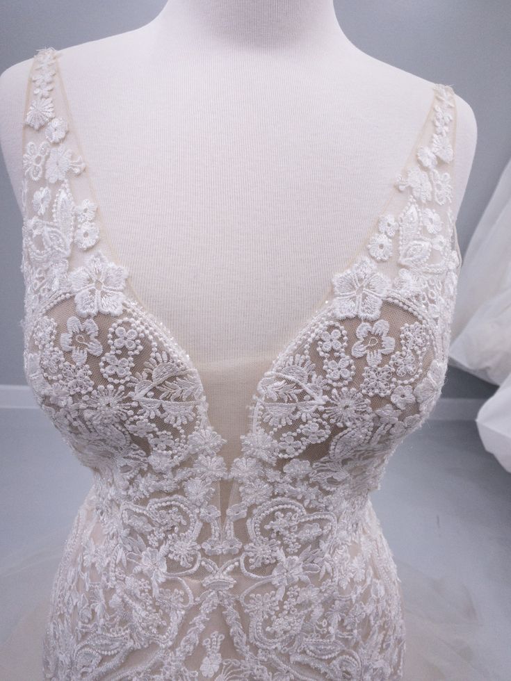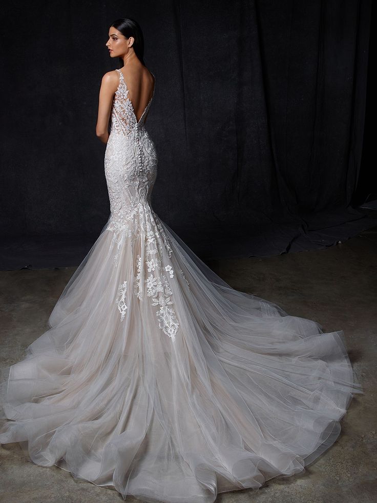 Enzoani Olinda is a sophisticated fit-and-flare gown featuring a V-neck adorned with sparkly appliqué + soft tulle! Feminine and romantic, this gown has all the classic elements of a trumpet gown. With all over chantilly lace and a jaw dropping tulle skirt, this gown makes bridal prep easy. Complete with a low illusion v back and covered buttons. This look is finished with a stunning tulle chapel train.