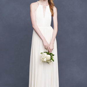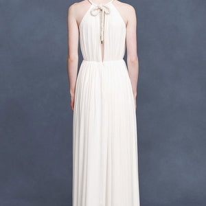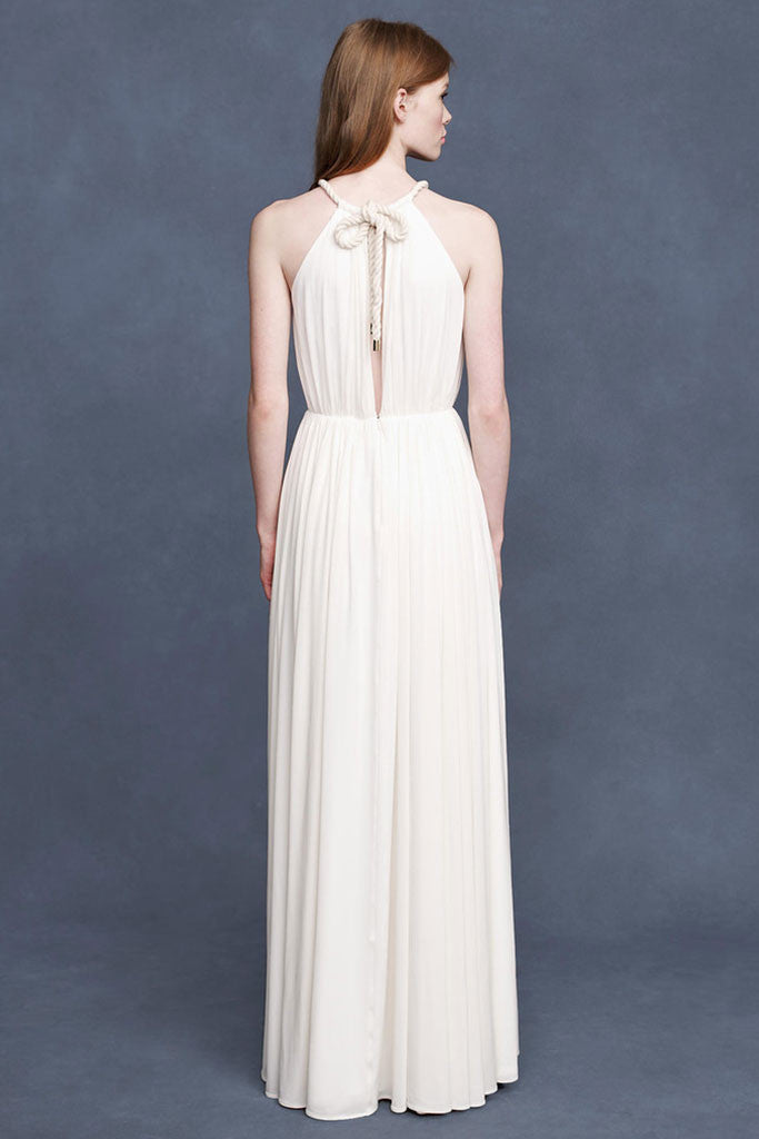 Straps and neckline are formed by a length of cotton rope that ties in the back like a halter -the ends, finished with gold tips