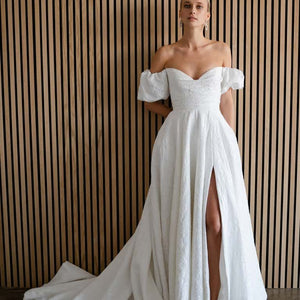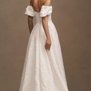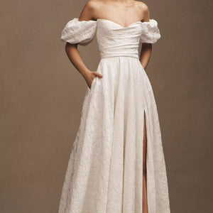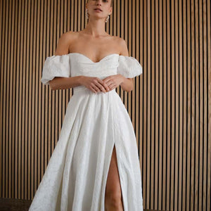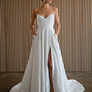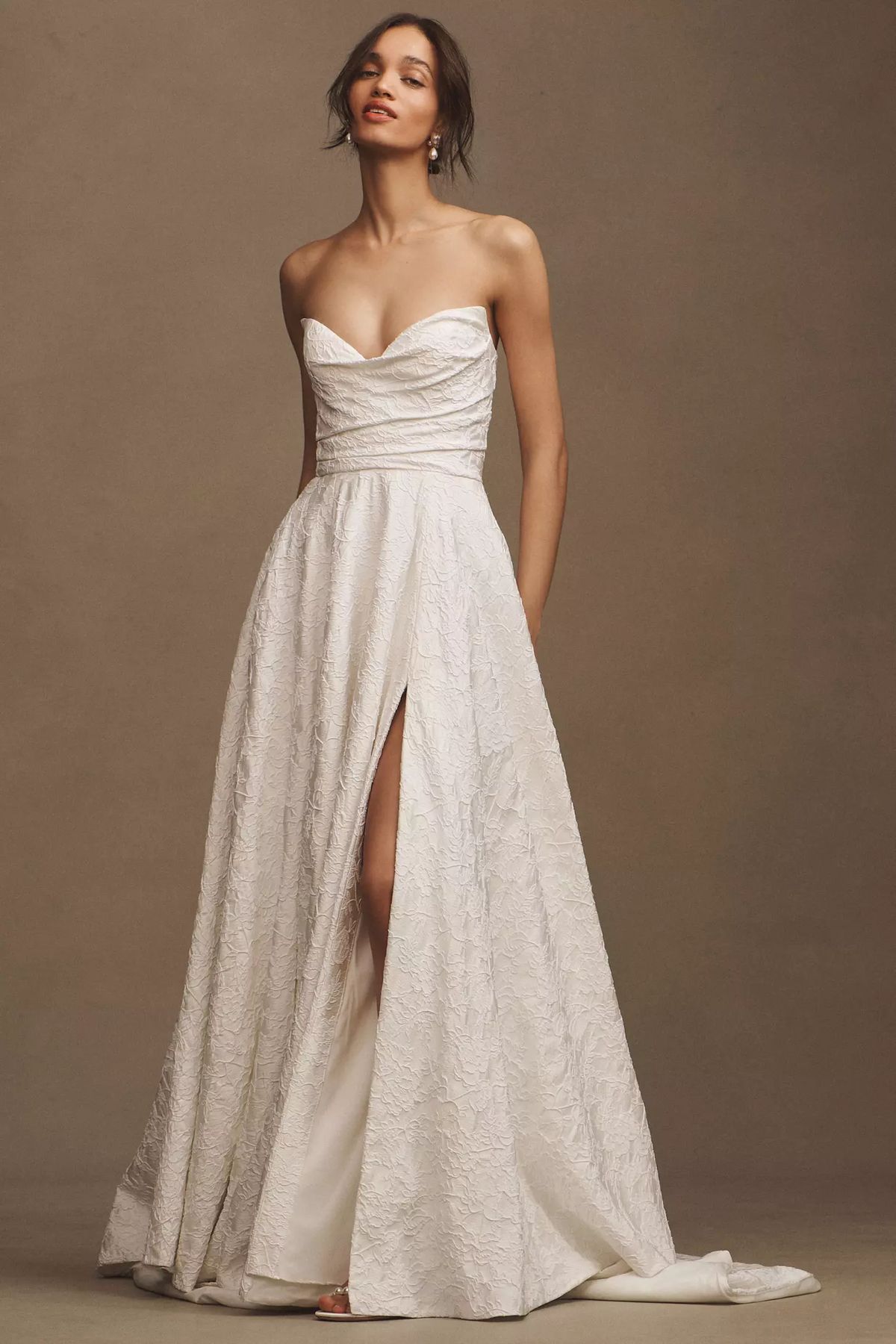 The Beau gown is a true romantic. Cut in our intricately textured beveled floral jacquard fabric, her dramatic silhouette is effortlessly airy. The sculpted bodice is endlessly flattering, and the detachable sleeves offer incredible versatility.