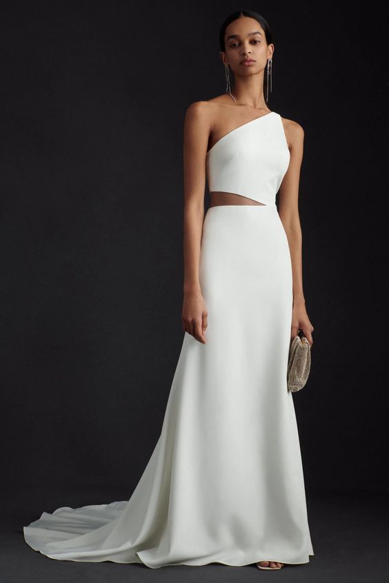 Made of the softest stretch crepe, the Jenny Yoo Blanca Fit & Flare Wedding Gown features one-shoulder styling, a side-waist illusion cutout, and a cascading chapel-length train that falls gently behind you.