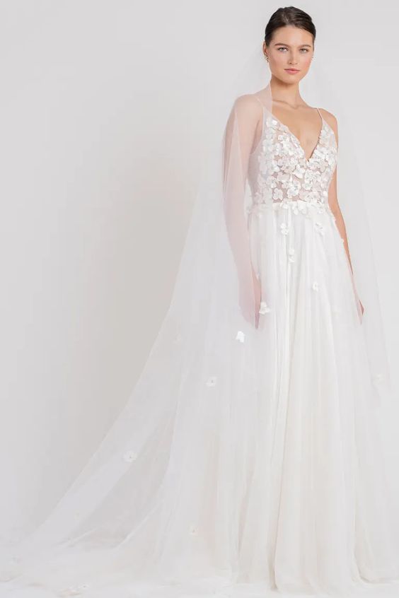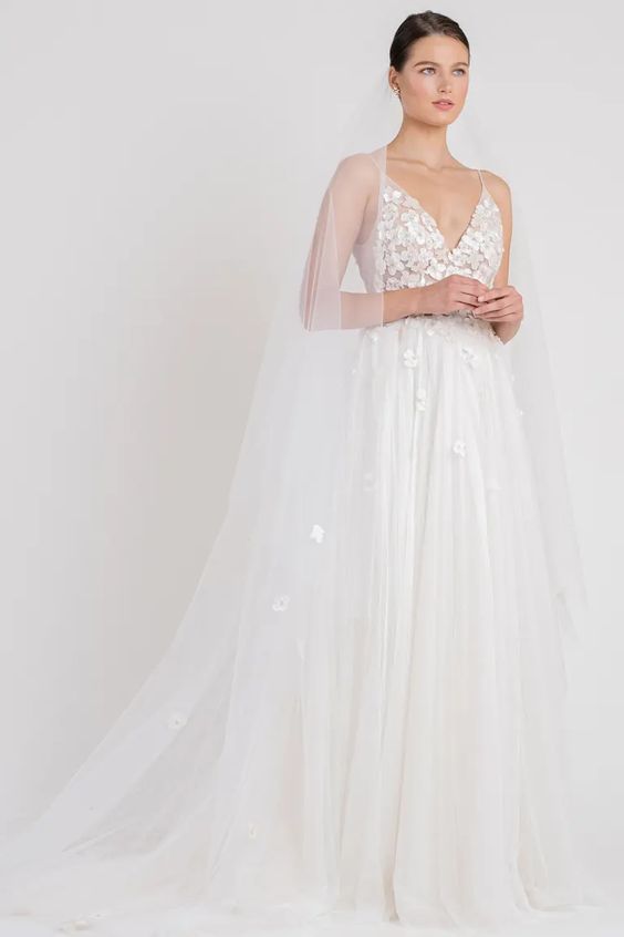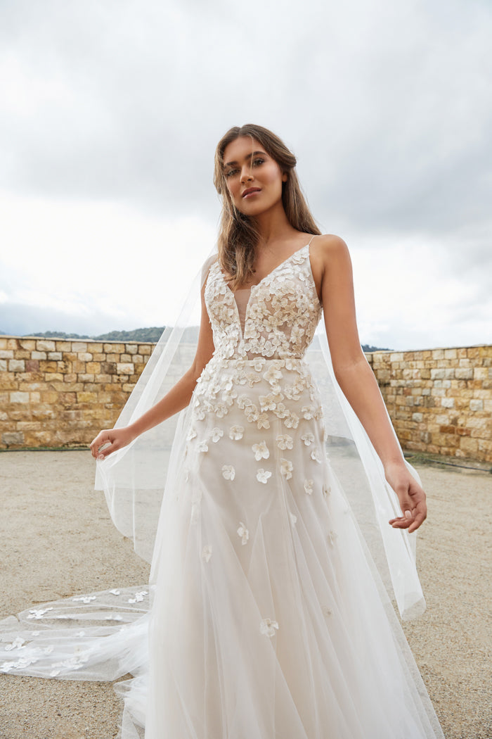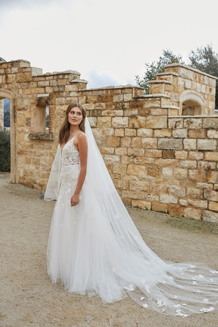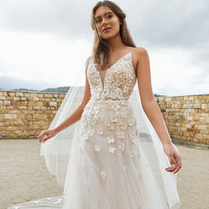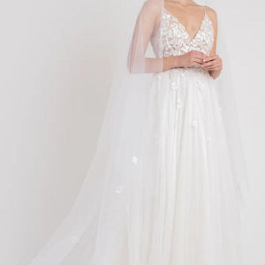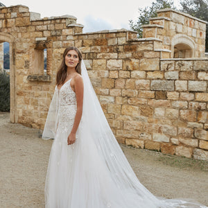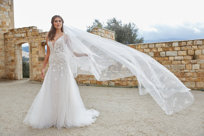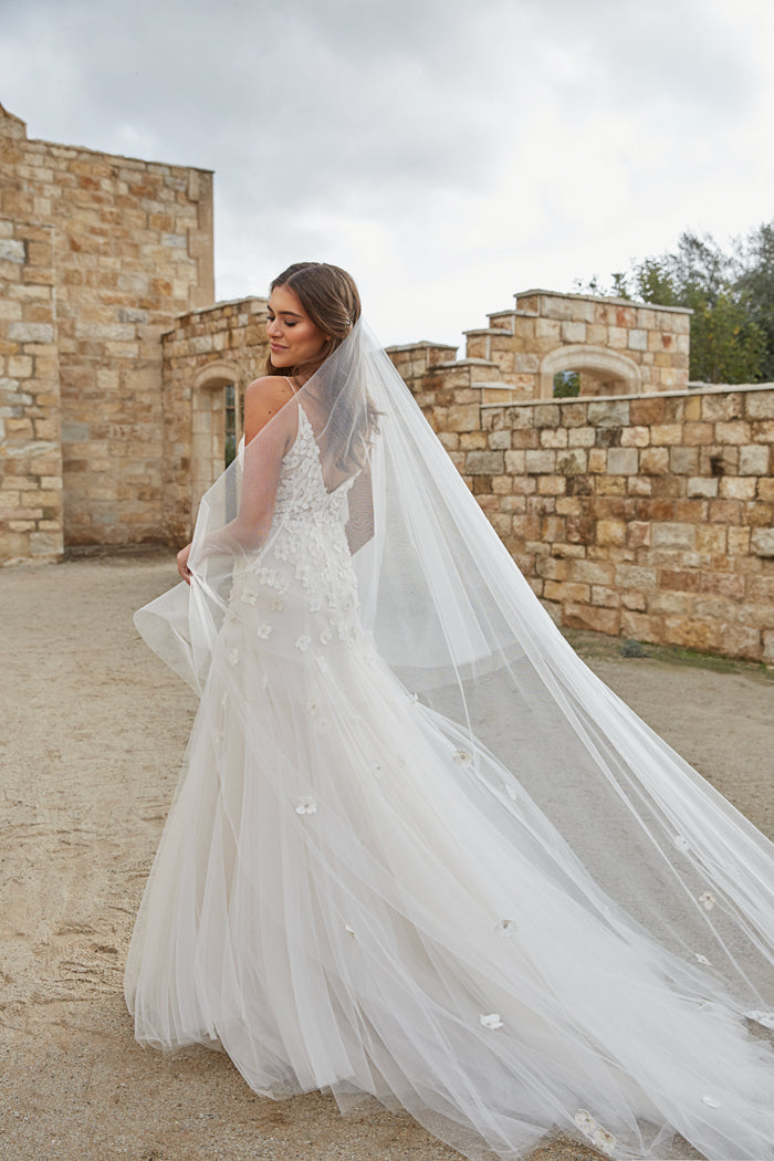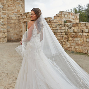 Dramatic with a touch of whimsy, the Gabriel Veil elevates cathedral length tulle with the delicate florets in ivory and light champagne.