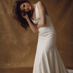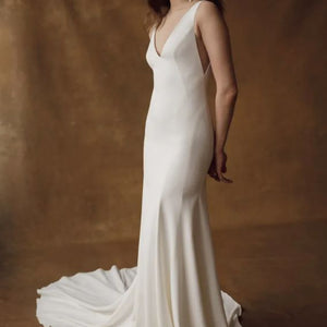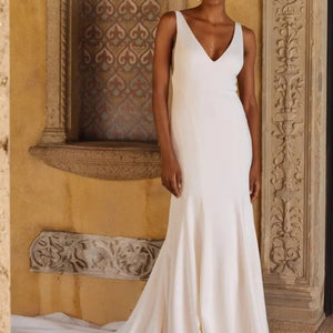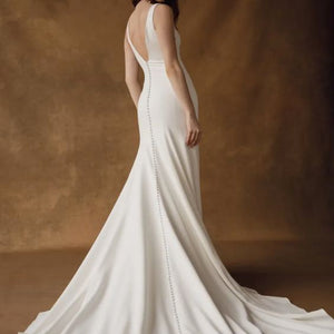The Hughes by Jenny Yoo is the epitome of modern elegance. Cut in an Italian crepe fabric, it features a classic V neck and fit and flare silhouette sculpted by architectural seam lines that highlight and flatter your every curve. This dress is fully lined and features buttons all the way down the train.