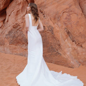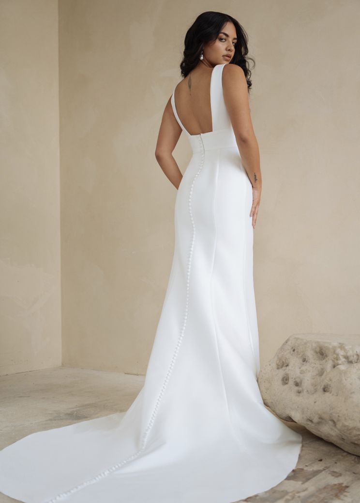 The Ilana gown is the epitome of sleek and chic. Cut in our lustrous soft stretch faille, the fabric gives off a slight sheen that elevates the gown for a more formal feel. The plunging neckline is anchored by a flattering cummerbund waist. The gown does not have a slit.