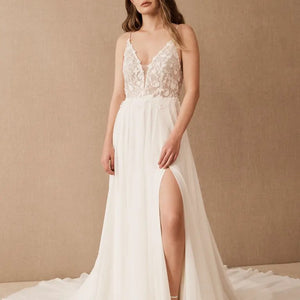 The Kelsey wedding gown by Jenny Yoo boasts intricate semi-sheer floral lace atop a deep-v bodice, with an illusion panel for structure. An ethereal, flowing skirt cascades to the floor, and a front-left slit adds dramatic allure.