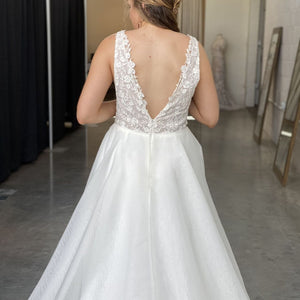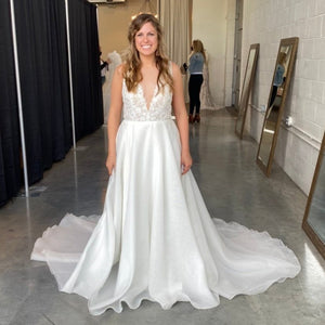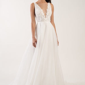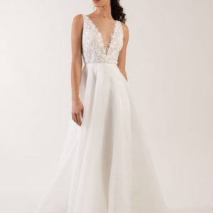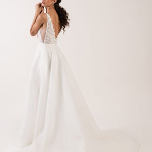 Rosamund is a romantic A-line wedding dress in airy organza with a beaded lace bodice and plunging illusion V neck neckline. Light weight and very comfortable, with a lace bodice and a full organza skirt. It would be perfect for an outdoor wedding and could easily complement any wedding style.