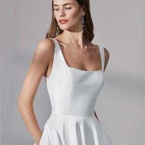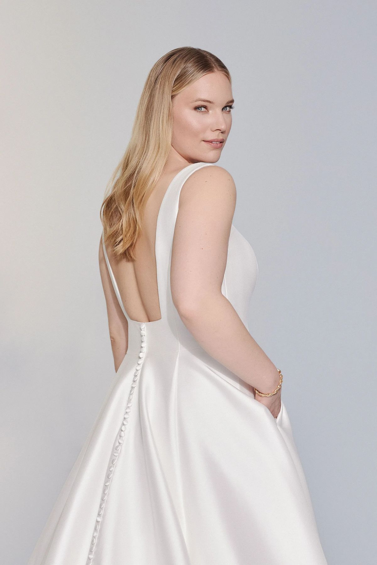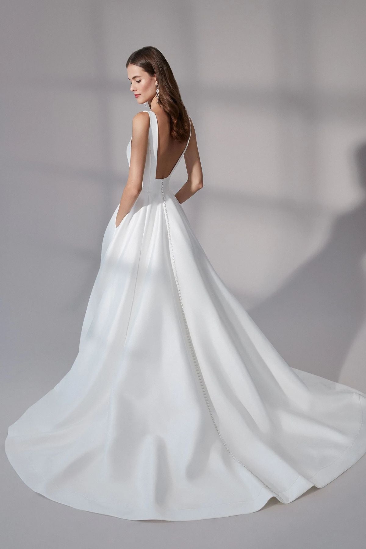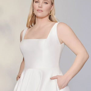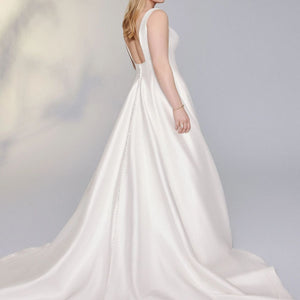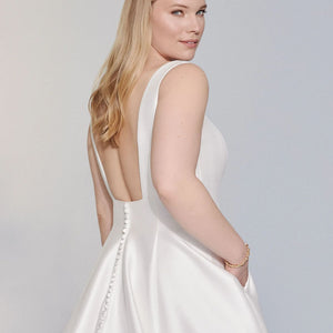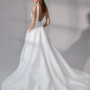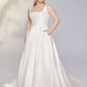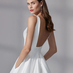 Look gorgeous on your wedding day wearing this simply chic stretch Mikado ball gown. It features a modern square neckline with a square back. The voluminous skirt features pockets while a bias band hem adds a subtle detail. Mikado covered buttons to the end of the chapel length train are the finishing touch.