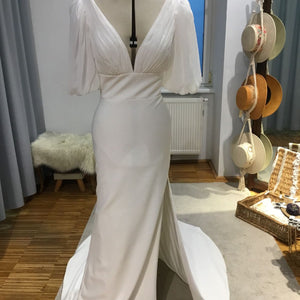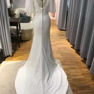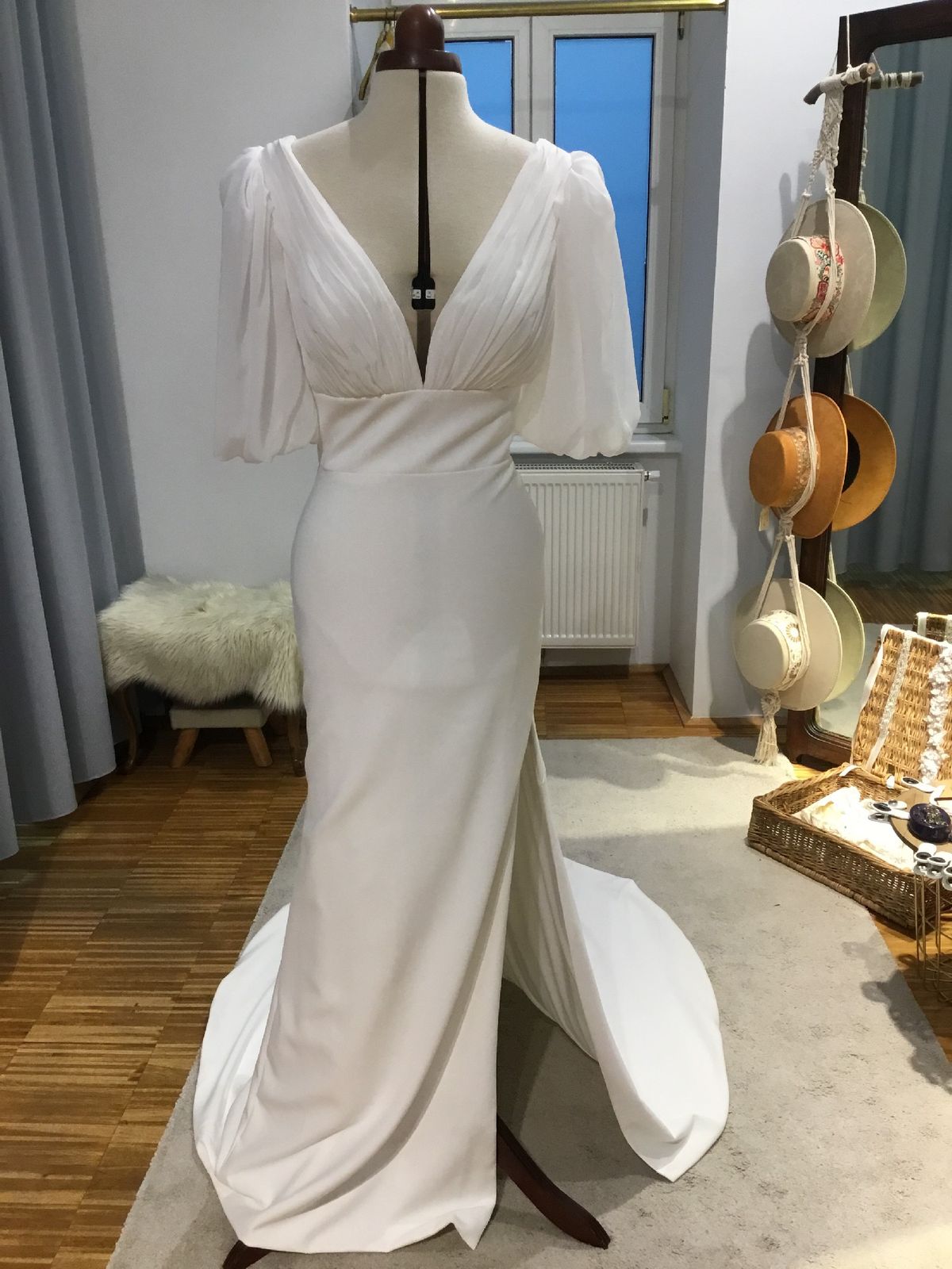 Crepe fit and flare bridal dress with chiffon bodice and short sleeves.
