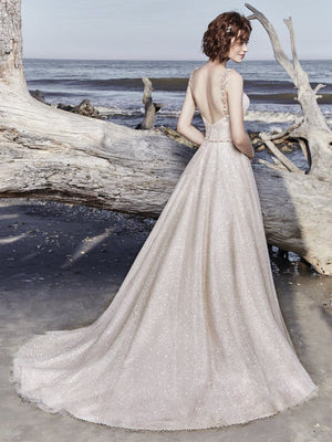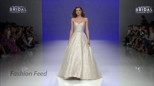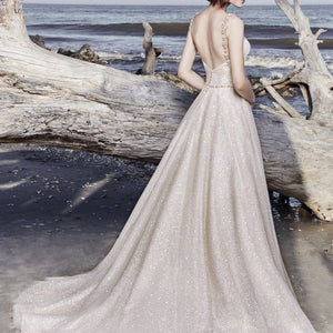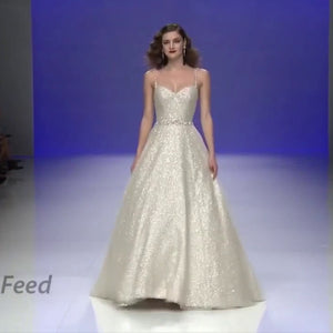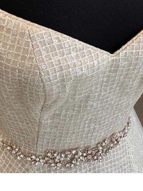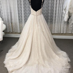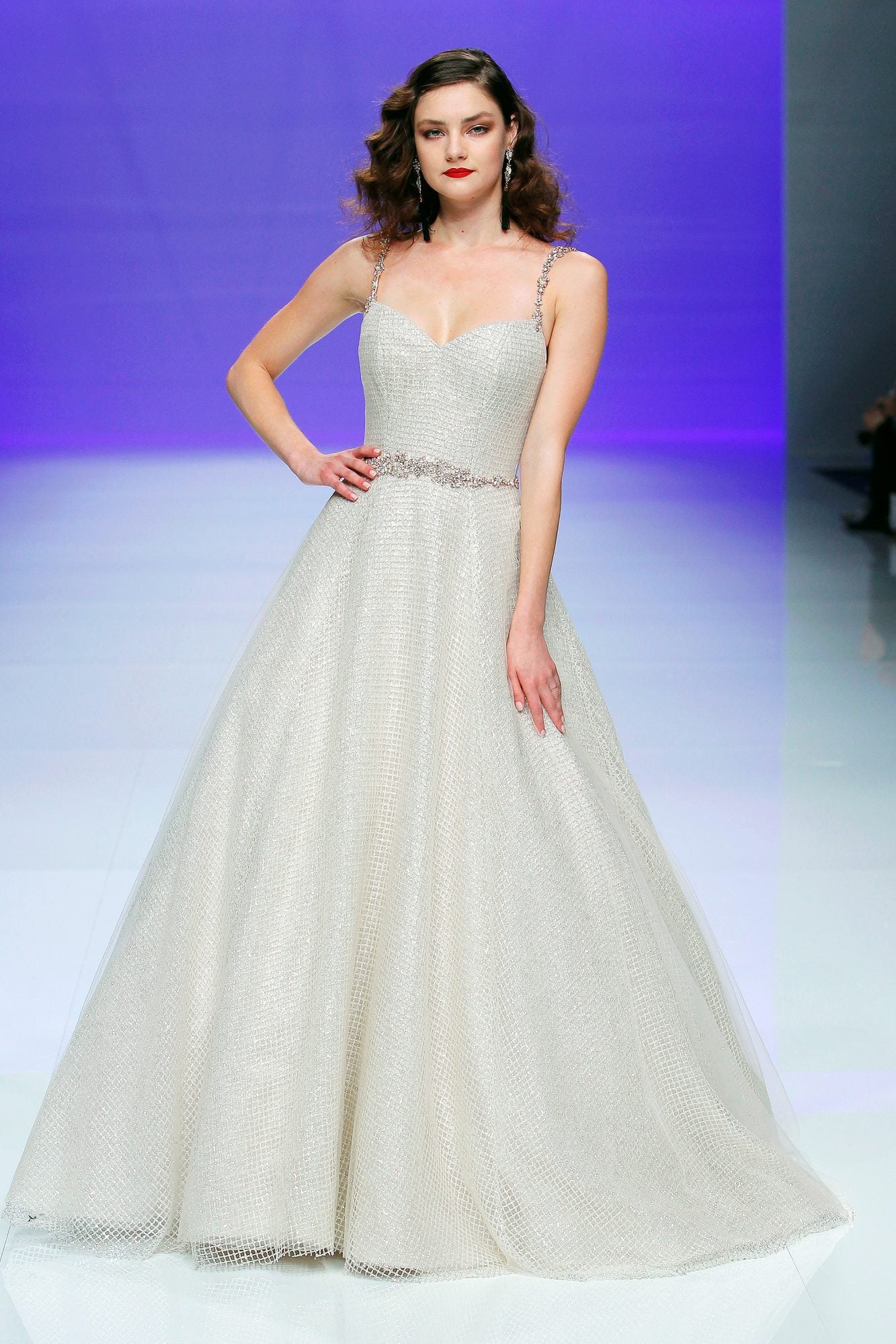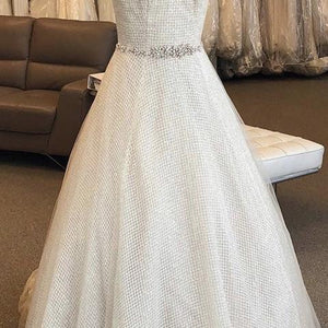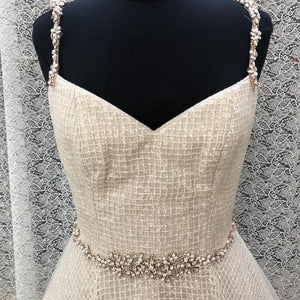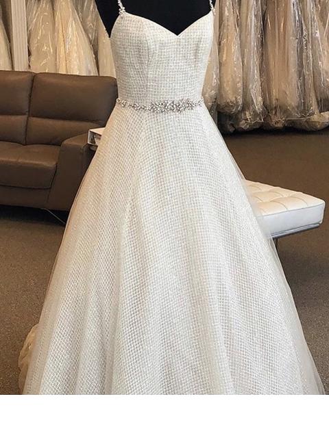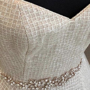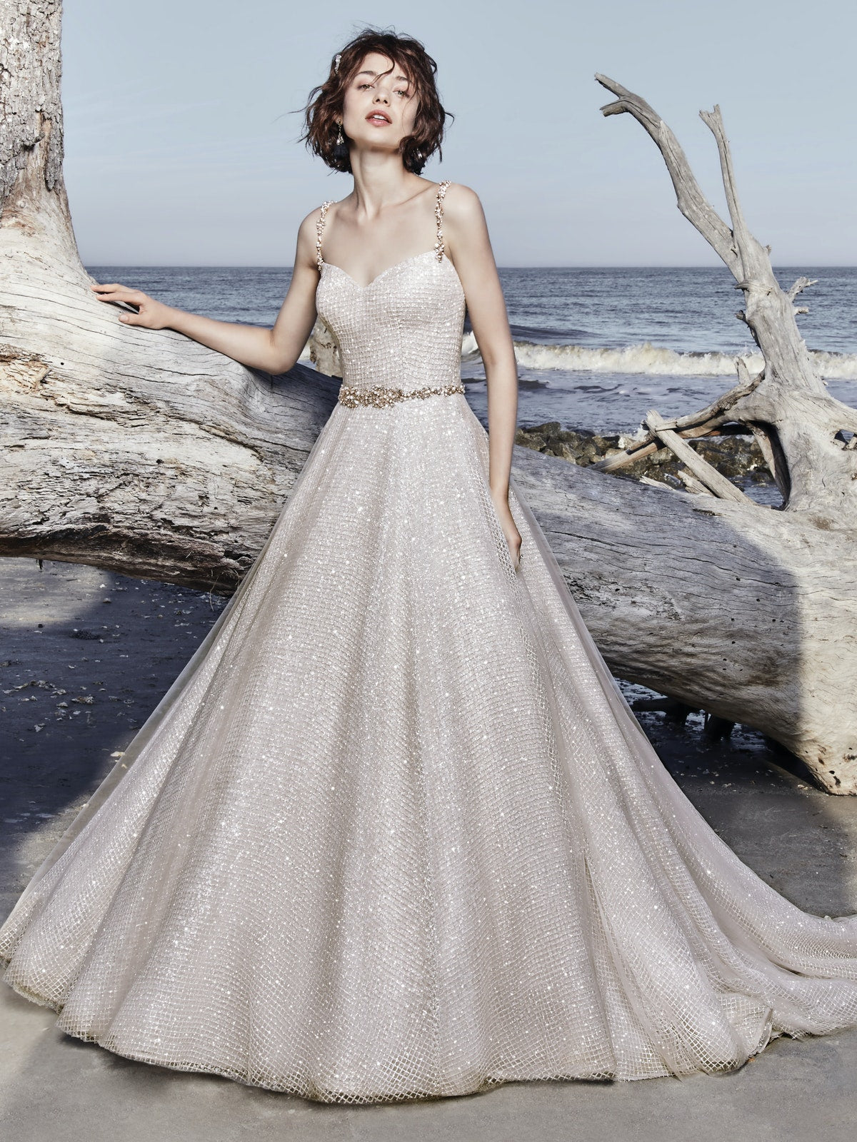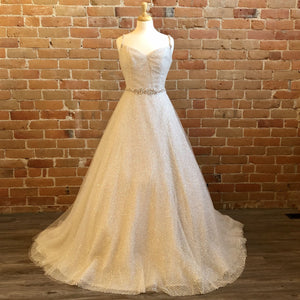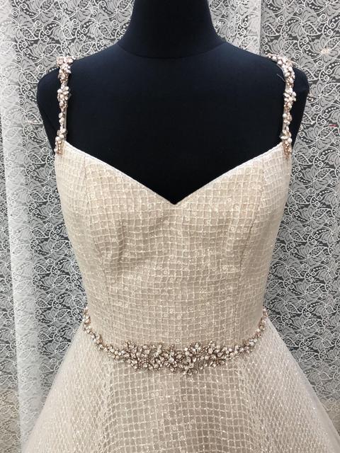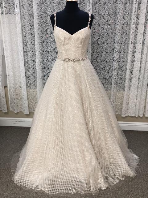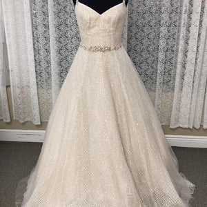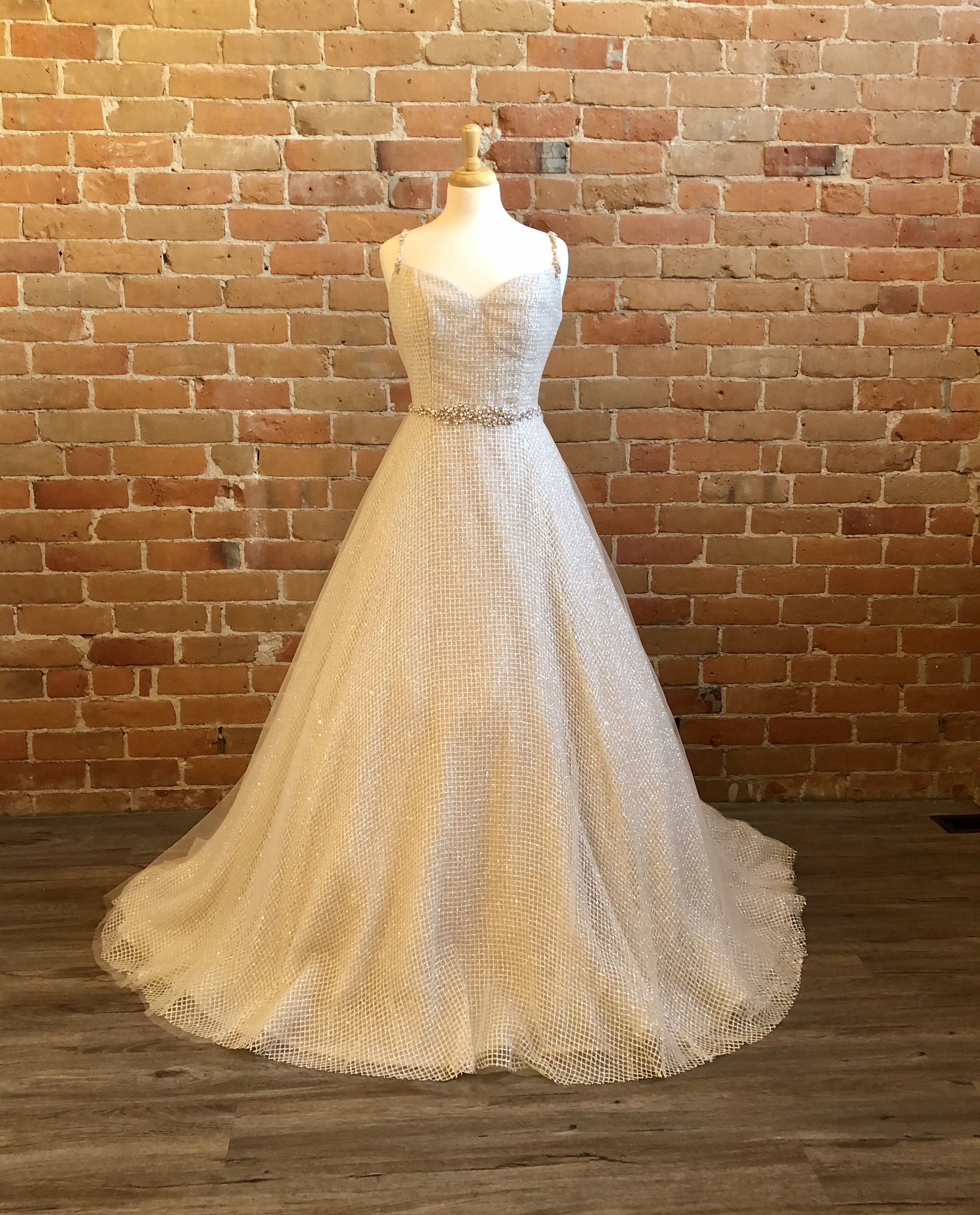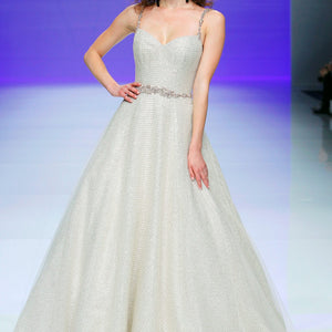 Channeling glamour and sophistication, this modern princess ballgown features a shimmering crosshatch tulle. Swarovski crystals accent the attached beaded belt and spaghetti straps, complementing the subtle sweetheart neckline and V-back. Finished with crystal buttons over zipper closure. This unique, shimmering and whimsical ballgown catches light from all angles!