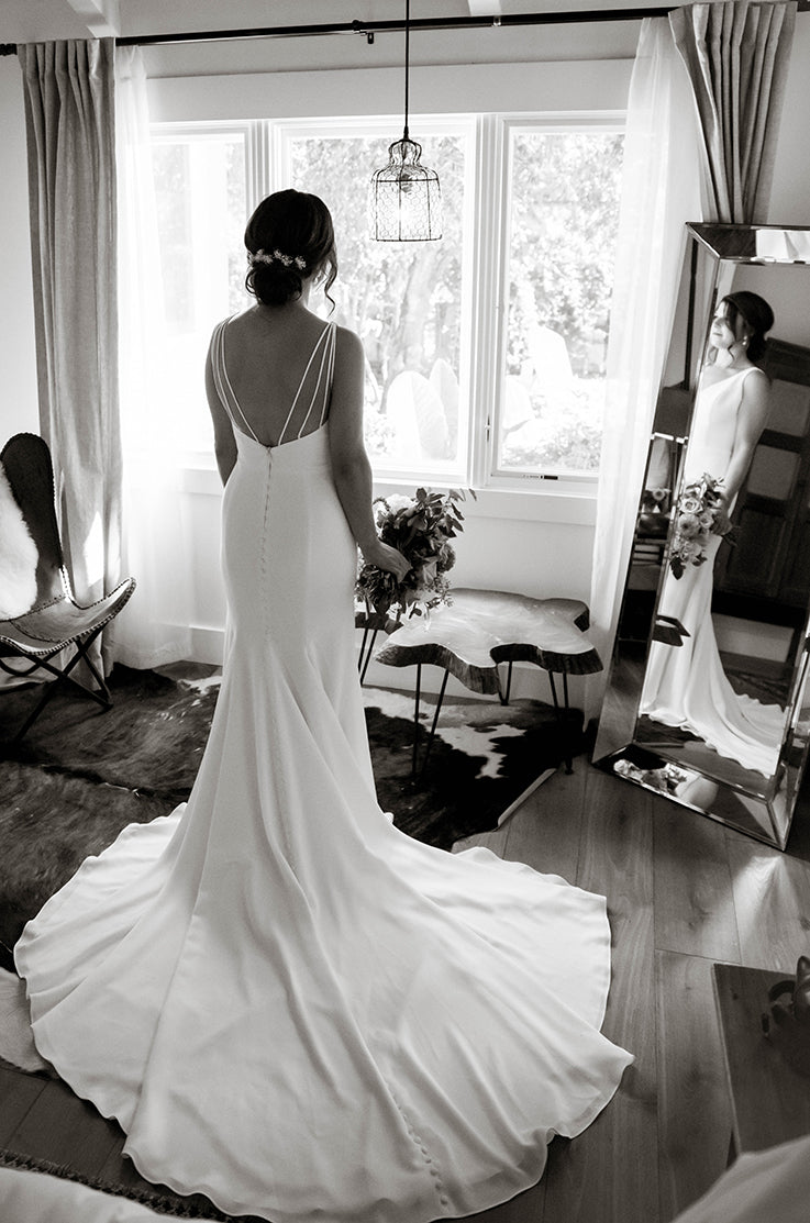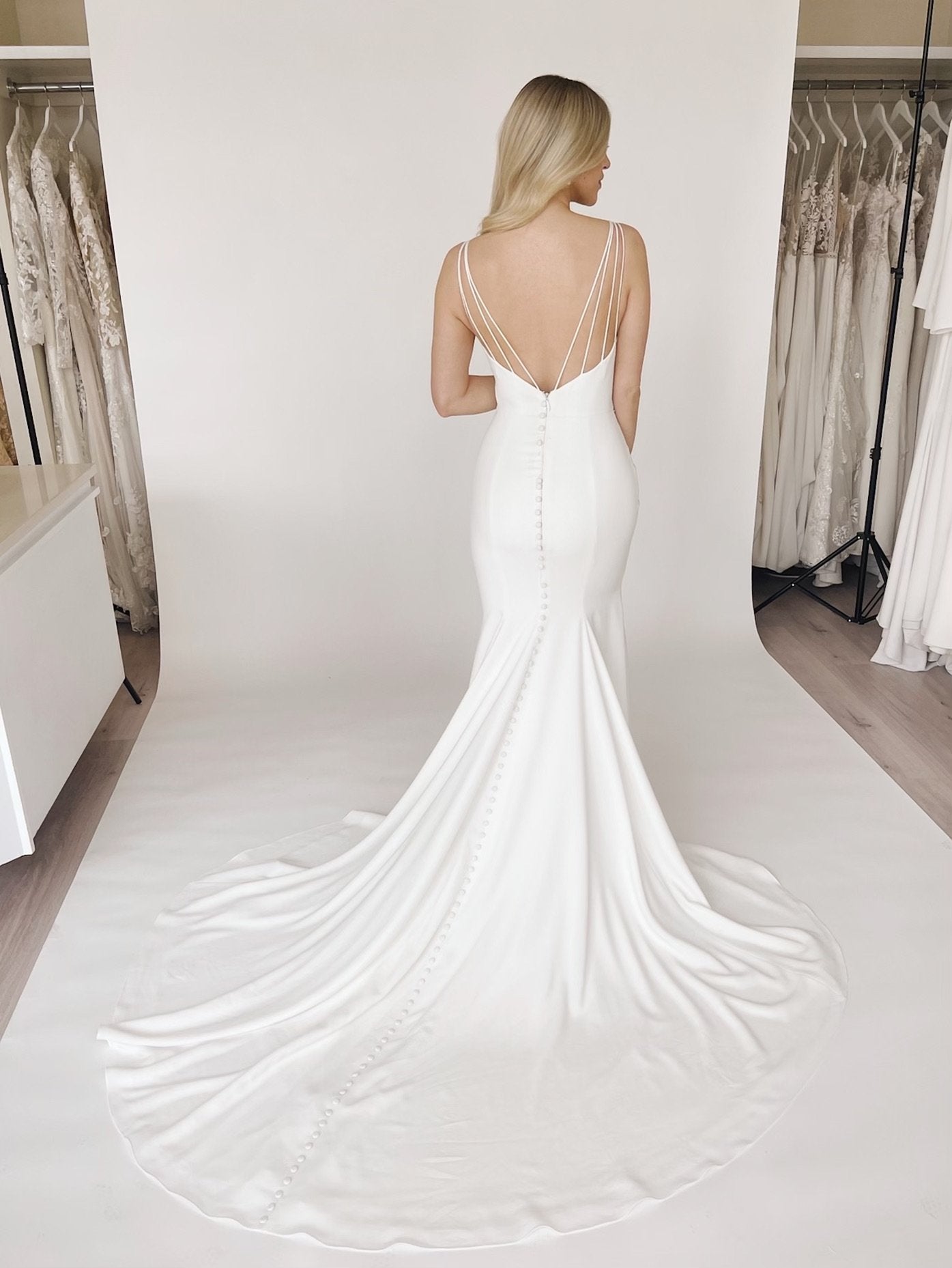 Crêpe Wedding Dress. Crêpe bodice with plunging V-neckline and multiple crossover spaghetti straps at back. Crêpe fit and flare skirt with center front slit. Fabric covered buttons down center back of skirt to hem. Removable beaded belt at waist (not included).