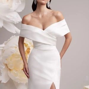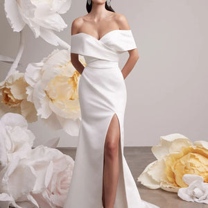 Mesmerizing elegant fitted gown. Featuring a sleek satin skirt with a leg slit and a graceful off-shoulder draped collared bodice with a sweetheart neckline that accentuates your natural beauty.
