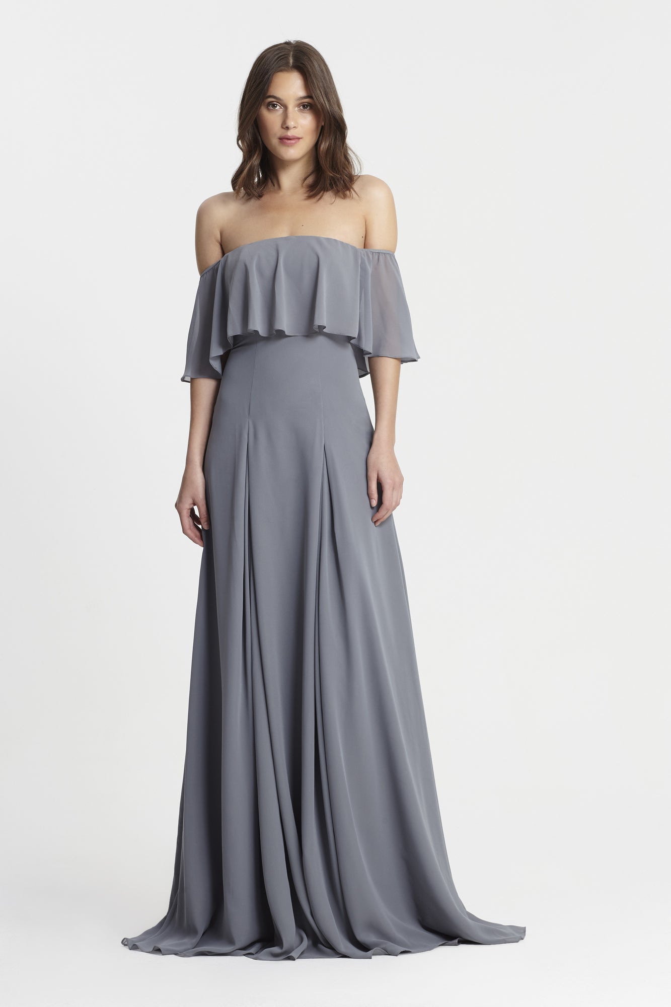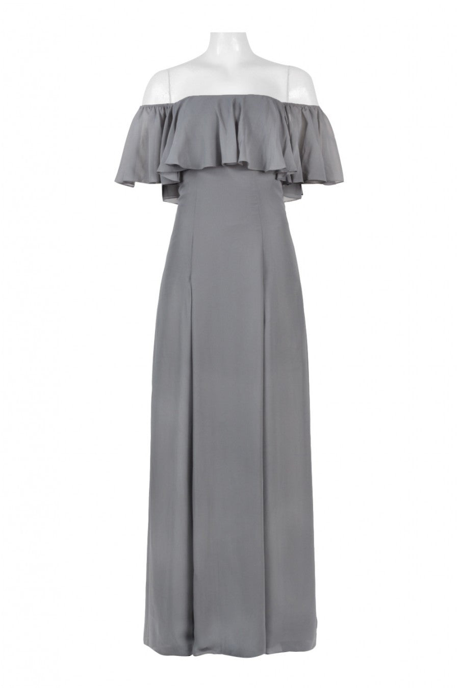 Monique Lhuillier Off the Shoulder Chiffon Gown - Steel Gray