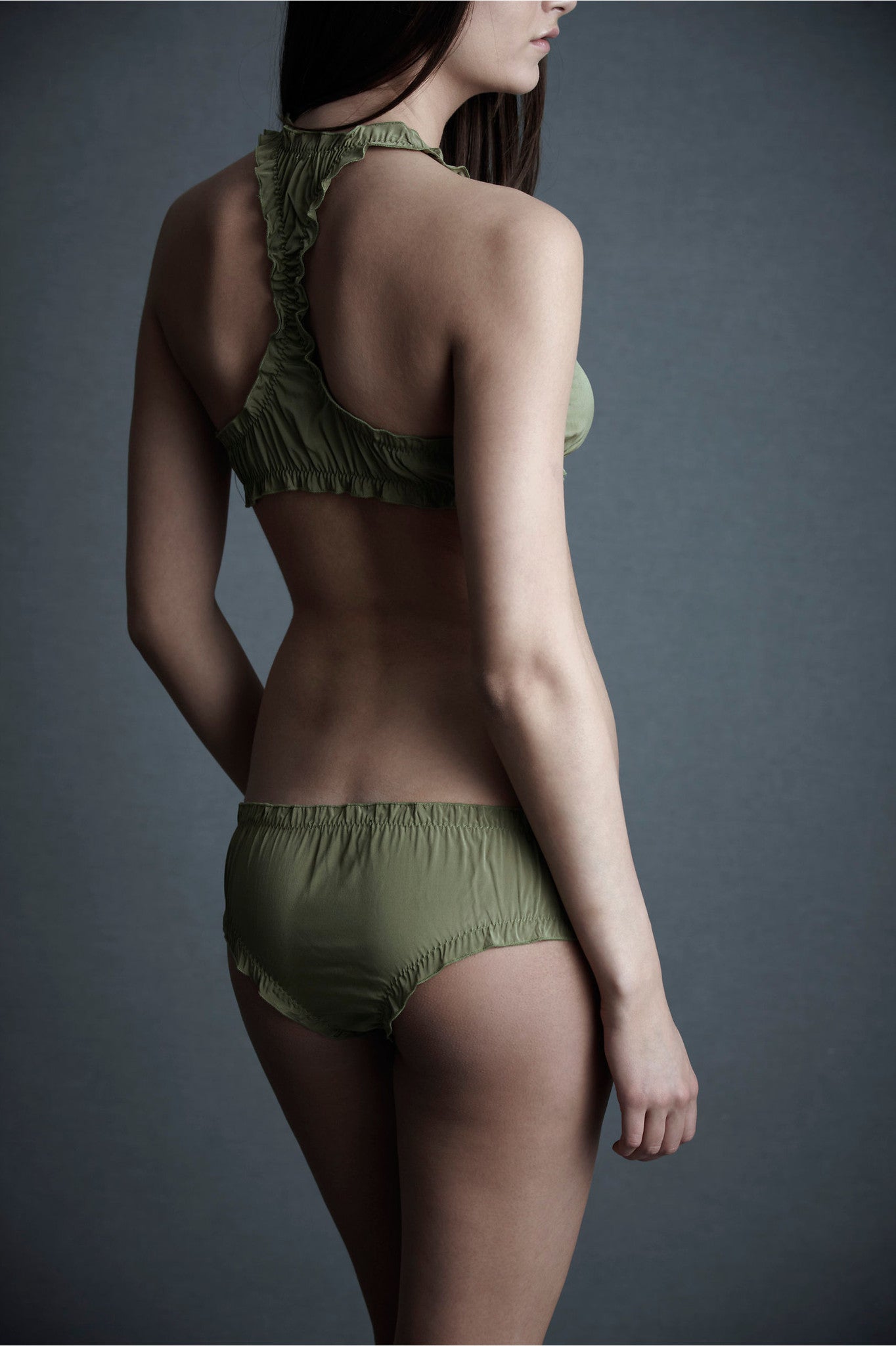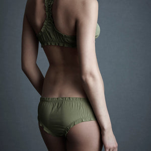 Ruched and mossy-hued satin silk, tied together with a flushed bow.