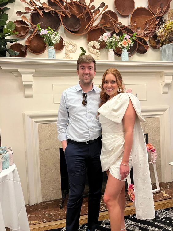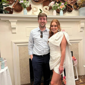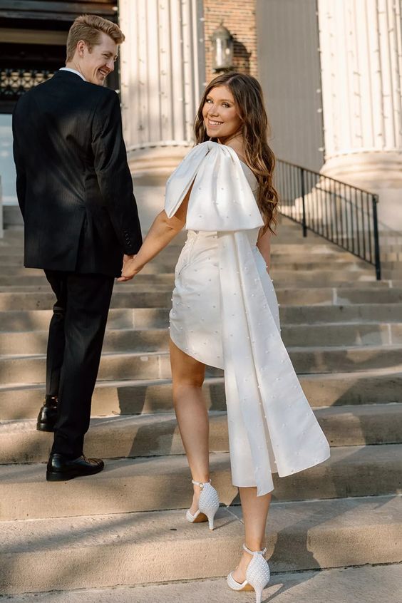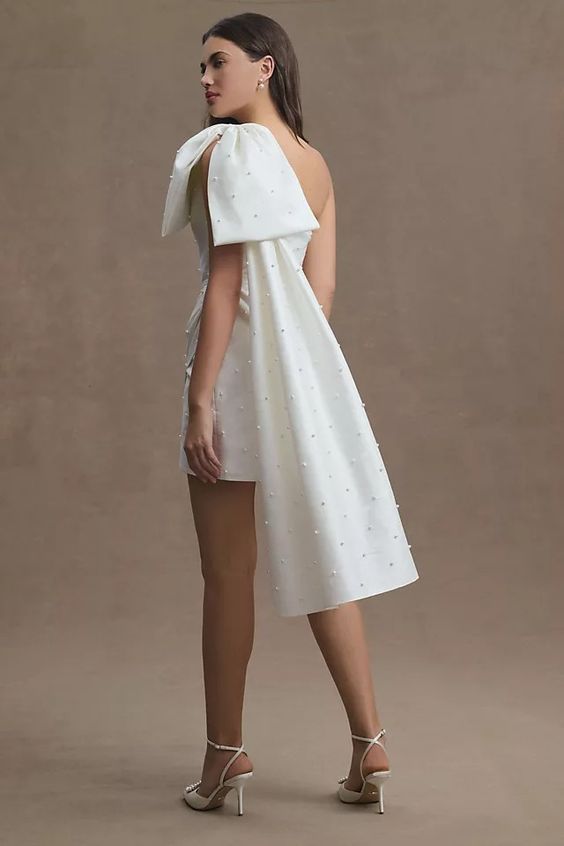 The Sachin & Babi Pippa Mini Dress is the perfect show-stopping number for every bridal occasion. This mini silhouette is made of a silky dupioni fabrication. A wrapped front and dramatic one-shoulder neckline with a bow sleeve are dotted with stunning droplets of beautiful pearls - finishing the look with a sea-inspired touch.