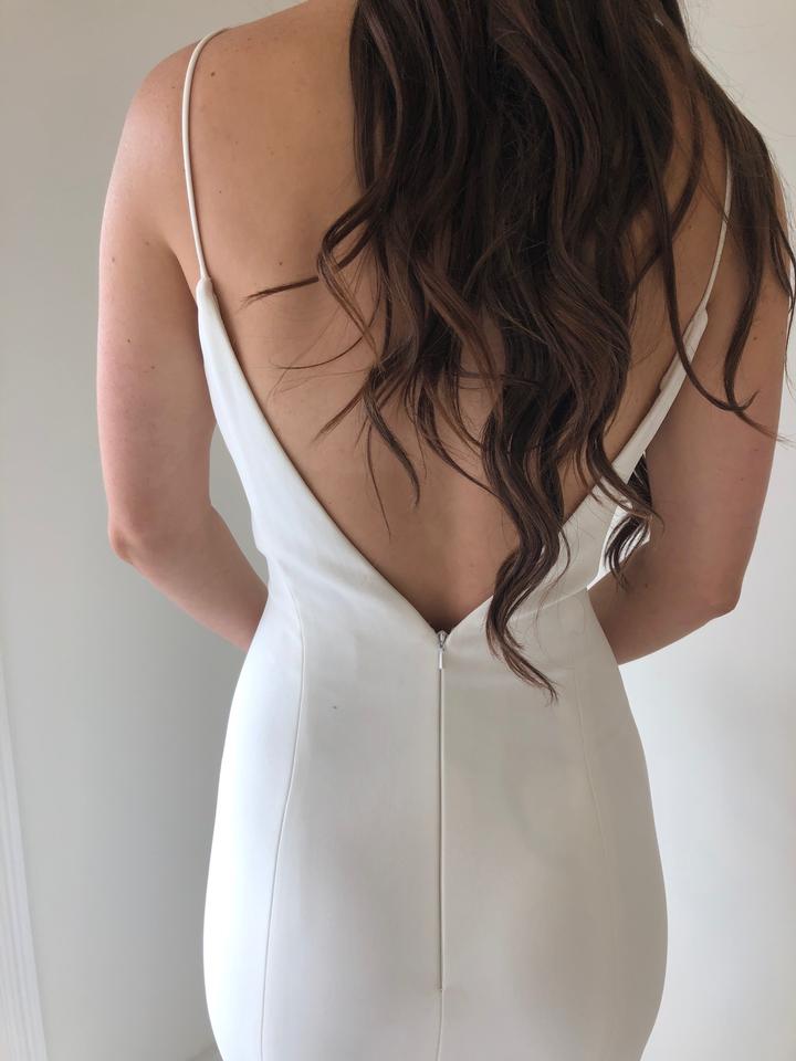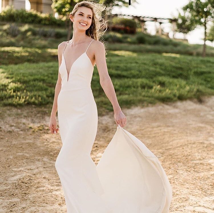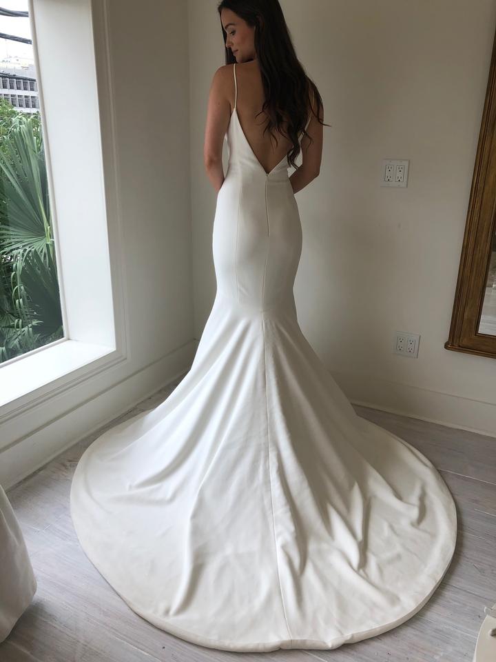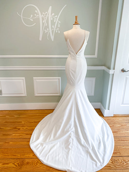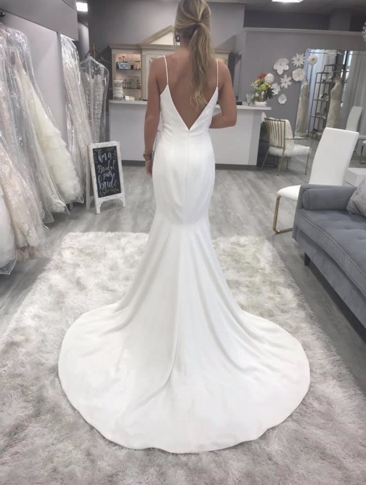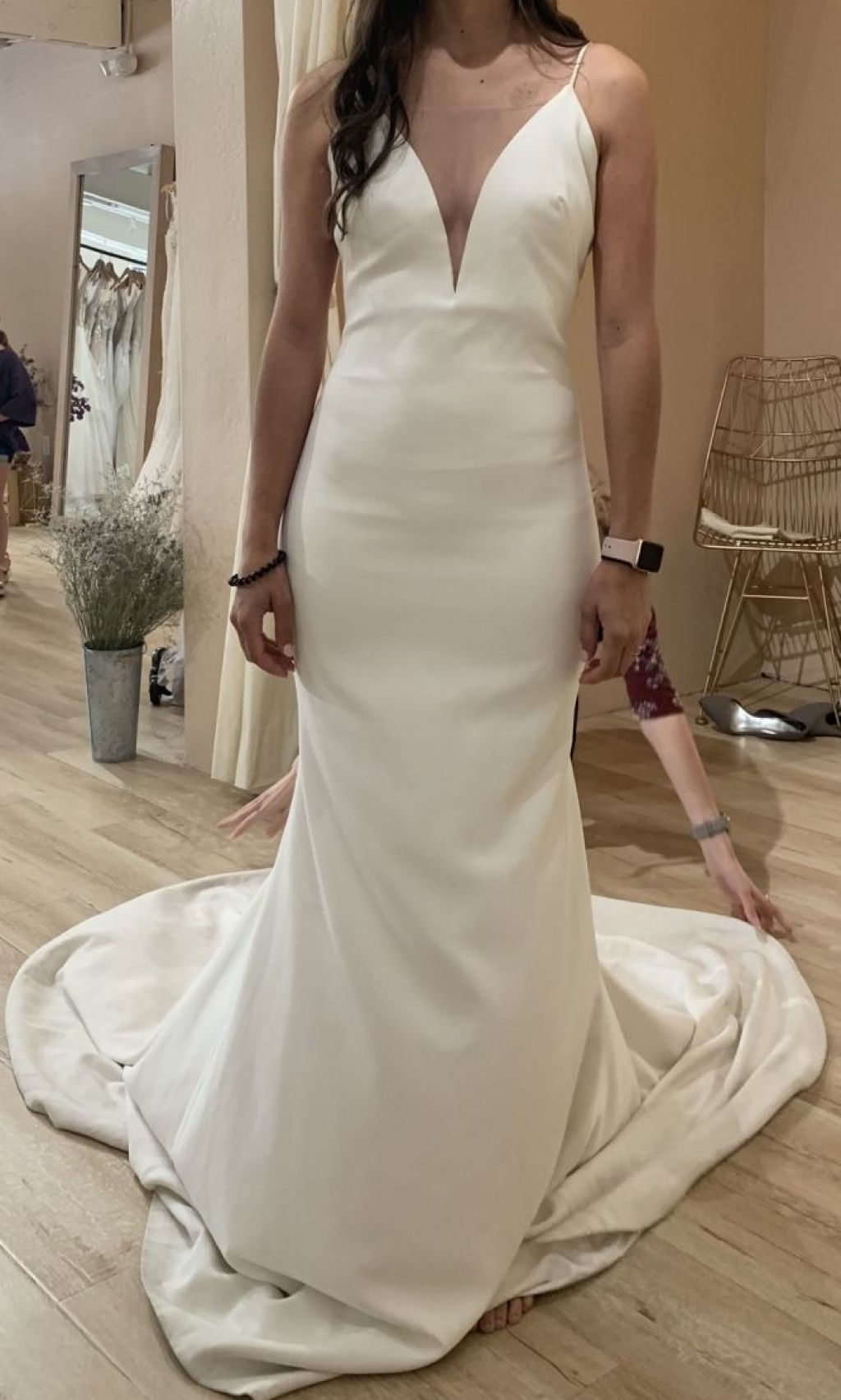 Size 12. This gown has been tired on in store and has minor dust along the hemline. Otherwise in like-new condition. Never worn outside the salon and never altered. Retail price: $1,450!
