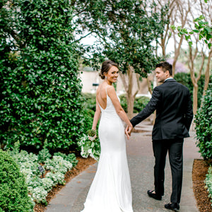 Sleeveless illusion deep v plunge stretch crepe mermaid flare gown.