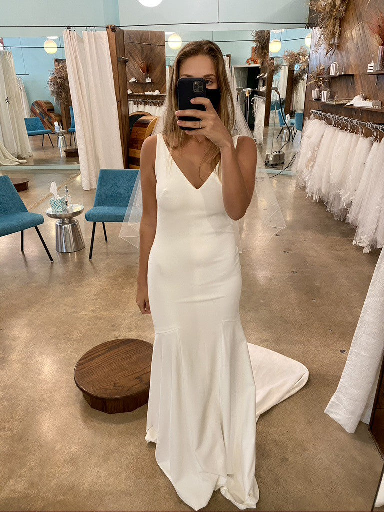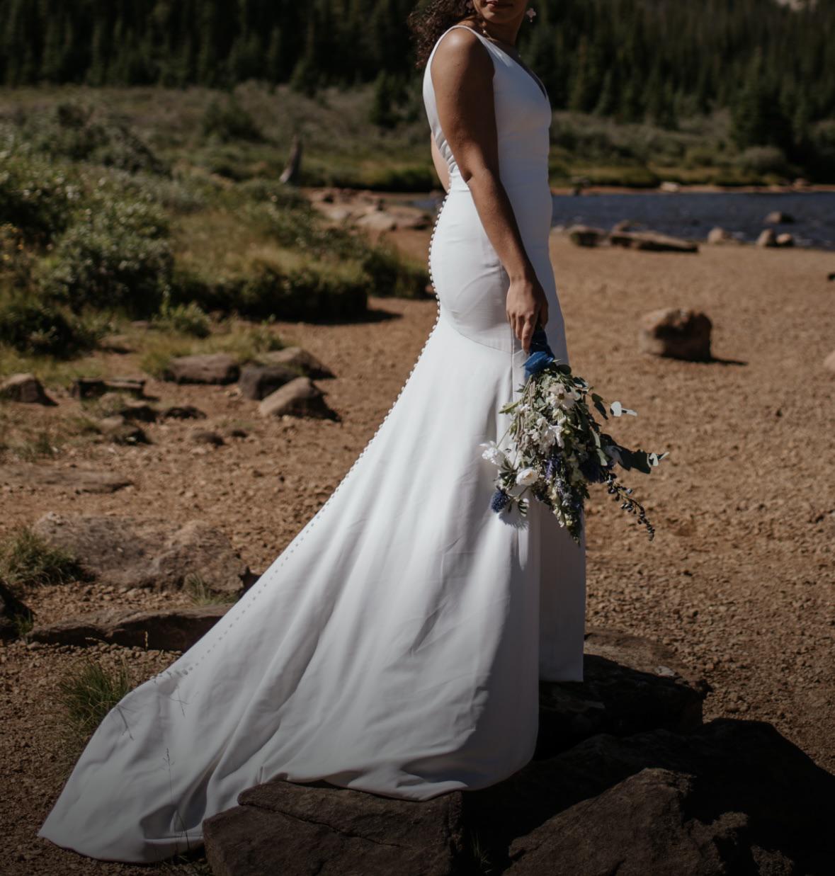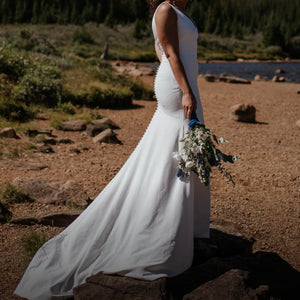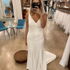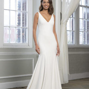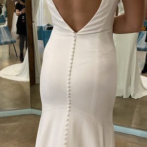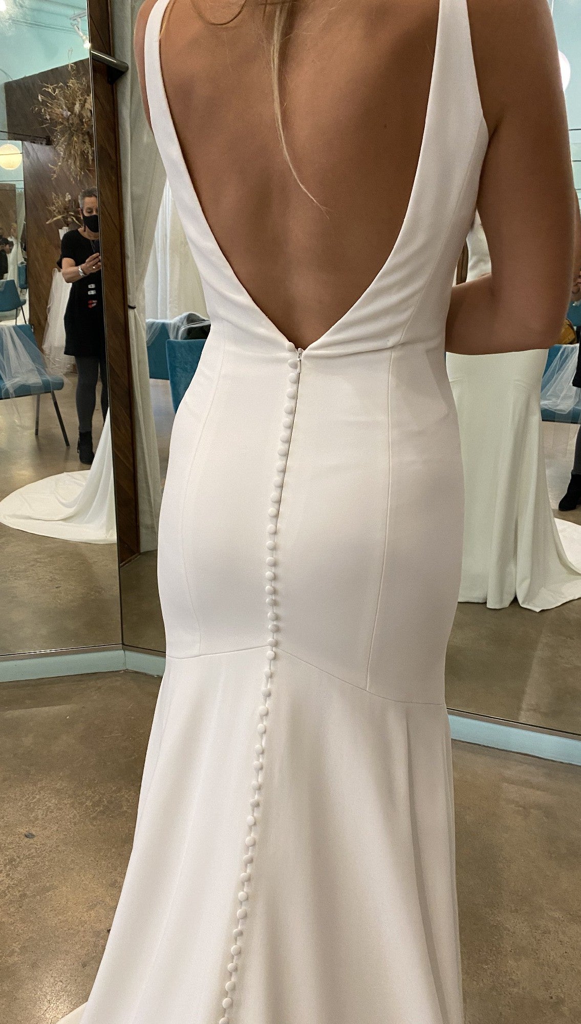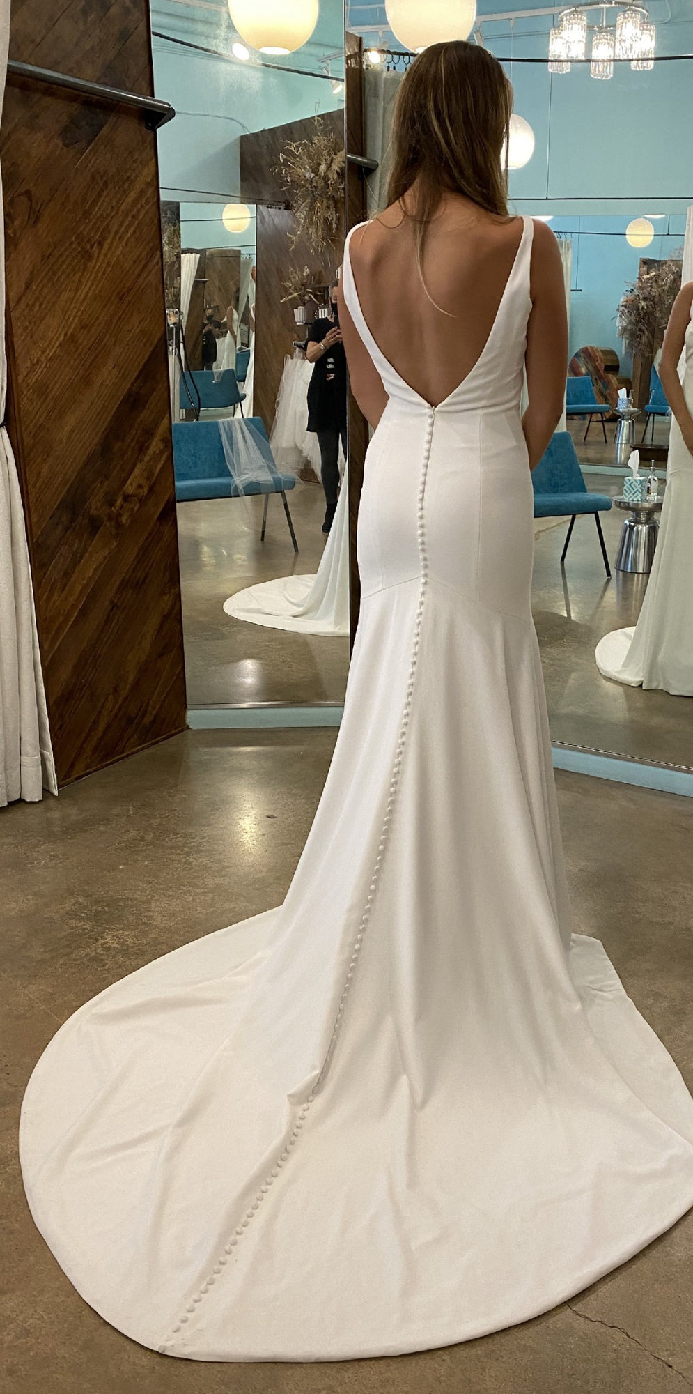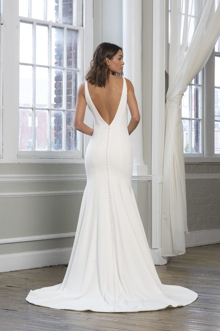 Theia Lynda is a chic crepe fit and flare gown. This simplistic look is elevated by the V neckline and thick straps that outline a low V back. Covered buttons line the back for a touch of glamor!