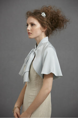 A gentle mandarin collar quietly glides into fitted shoulders before streaming into lovely draping sleeves; a luxuriously oversized bow takes in the action.