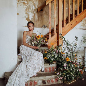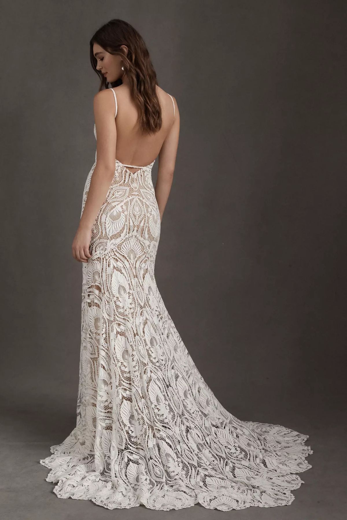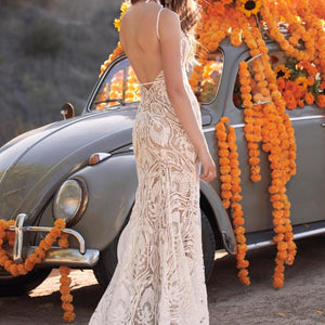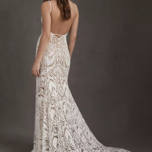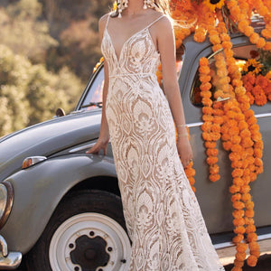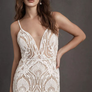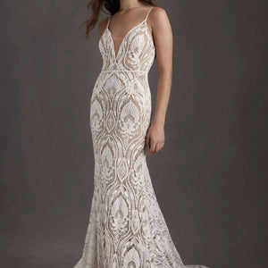 Boldly inspired by the wanderer in you, Bonnie boasts a plunging neckline and a strappy style bodice with a form-fitting skirt. Carefully placed lace paired with Abrazo stretch lining help to contour and compliment the body.