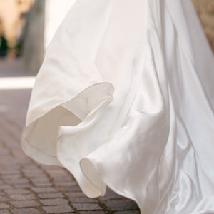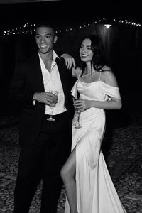 The drama is in the details with the fluid, body-skimming Willowby by Watters Lia Wedding Gown. Eye-catching asymmetrical straps, a low open back, and artful wrap draping adds a modern touch to this silky style - made daring with its sleek front slit. Simple and chic, with an asymmetrical twist. Draped and pleated in all the right places, adding visual interest and a unique silhouette.