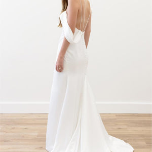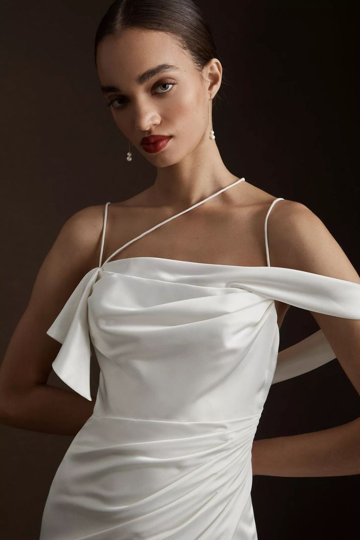 • Off-the-shoulder asymmetrical draped and spaghetti strap sleeves