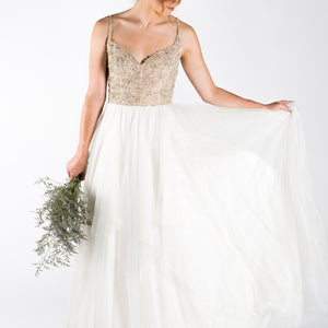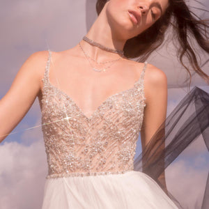 Nova's beaded bodice continues into elegant beaded straps that feature a stellar, star-like pattern that floats into its cascading Tulle skirt. Cascading multi-dimensional floor length Tulle Skirt with light train in the back. Design fades into a sharp beaded belted look to distinguish bodice from flowing tulle skirt.