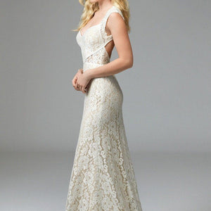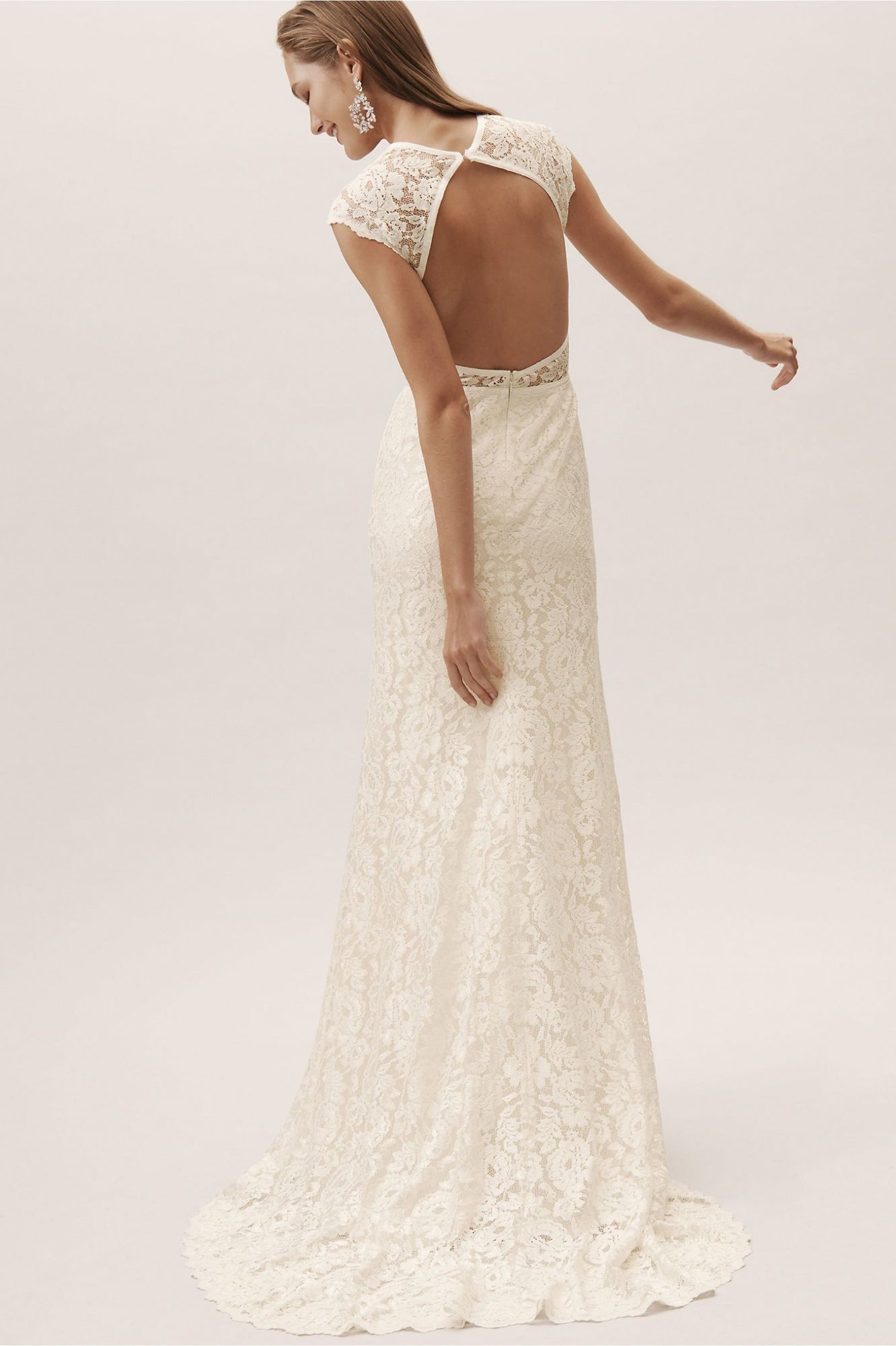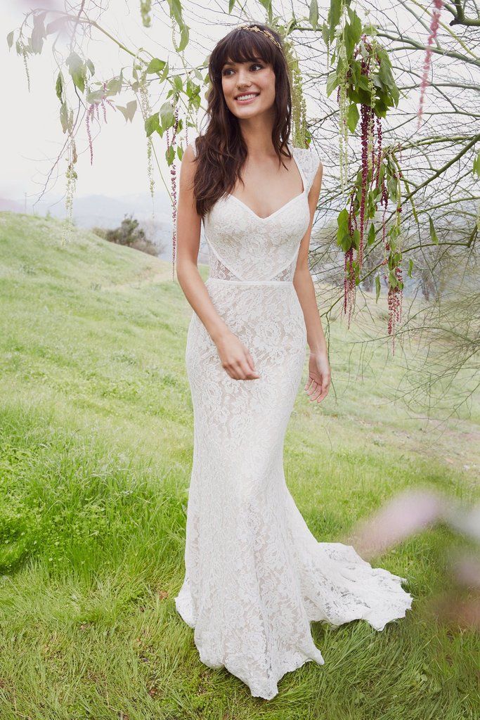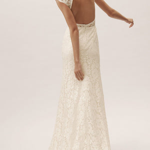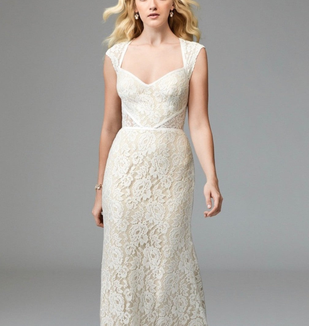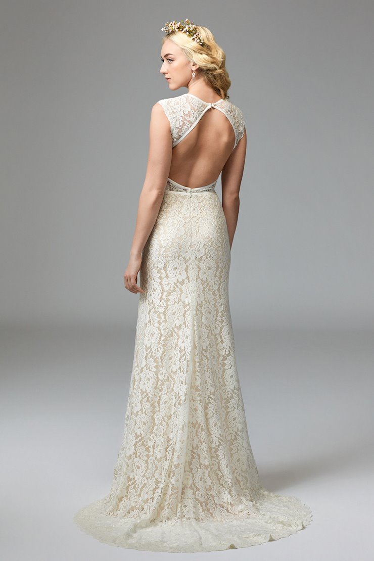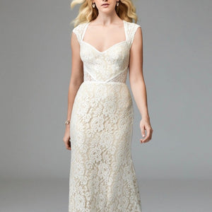 For the modern boho bride, look no further than our Twilla gown. Made of Zuzu Stretch Lace, this style is the perfect blend of soft and structured. Twilla features a Queen Anne neckline and keyhole back, and is trimmed with Grosgrain Ribbon detailing. Puddle Train.