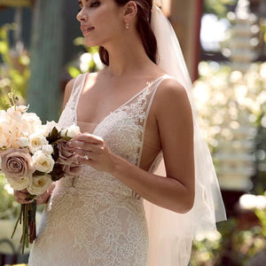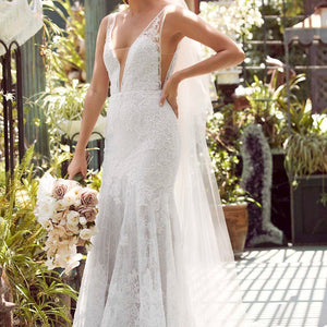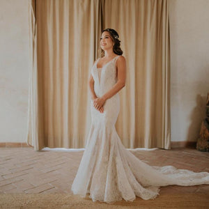 Kaplan is a dreamy lace fit and flare gown featuring a plunging V neckline and side cut outs with sheer inserts! Illusion lace straps lead into a deep V back, accentuated by the romantic, airy sweep train!