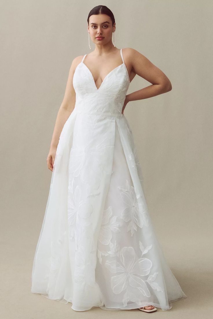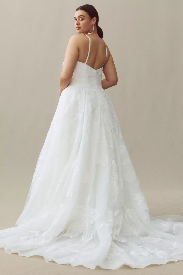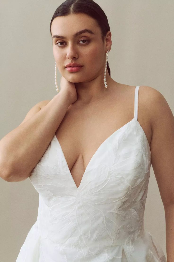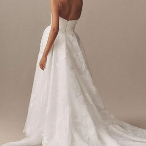 Both classic and on-trend, Romy's corset commands attentions with its eye-catching structure. The bodice beautifully contrasts with the billowing organza train, adding a touch of modern flair to timeless elegance.
