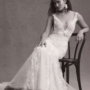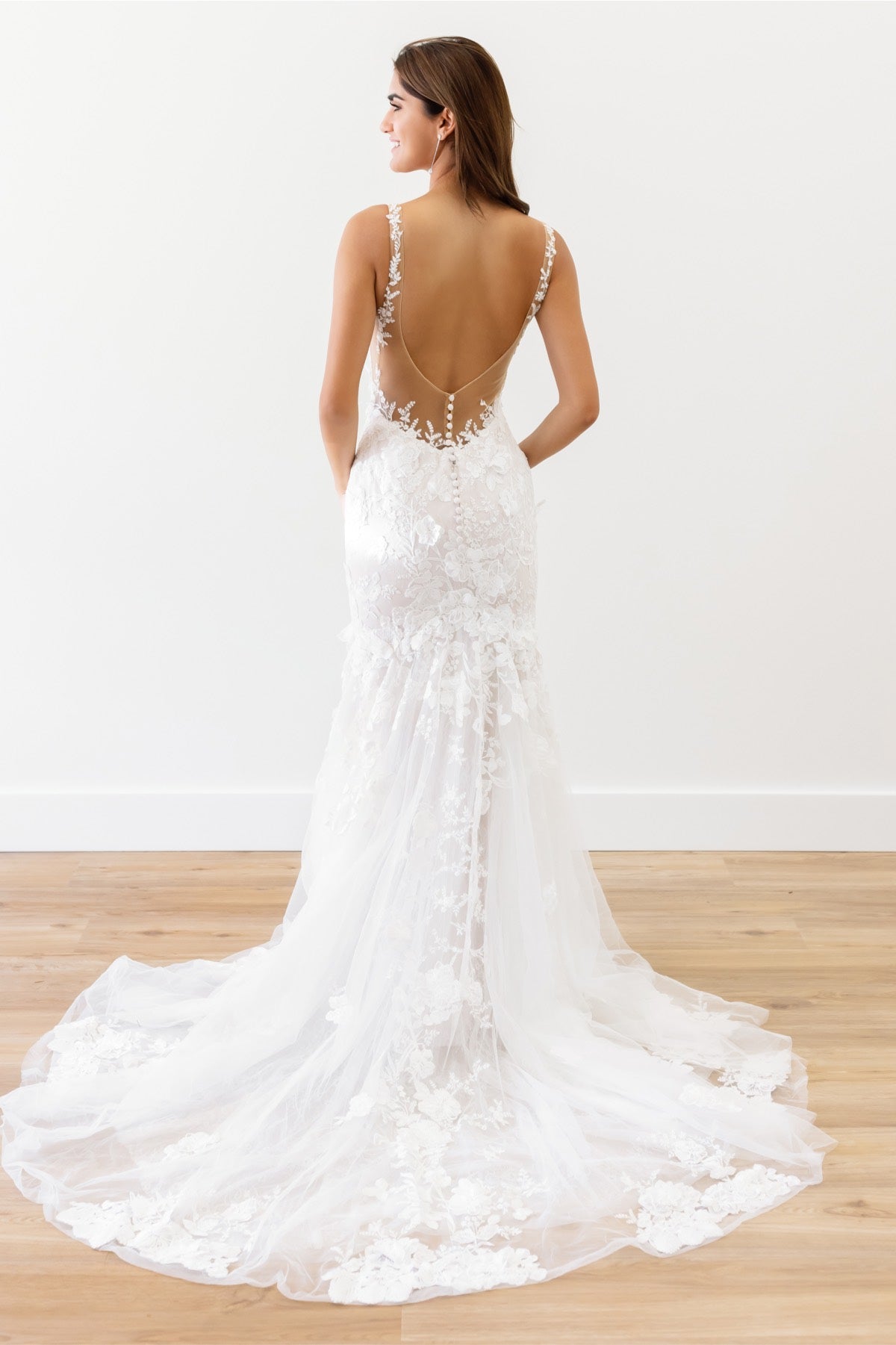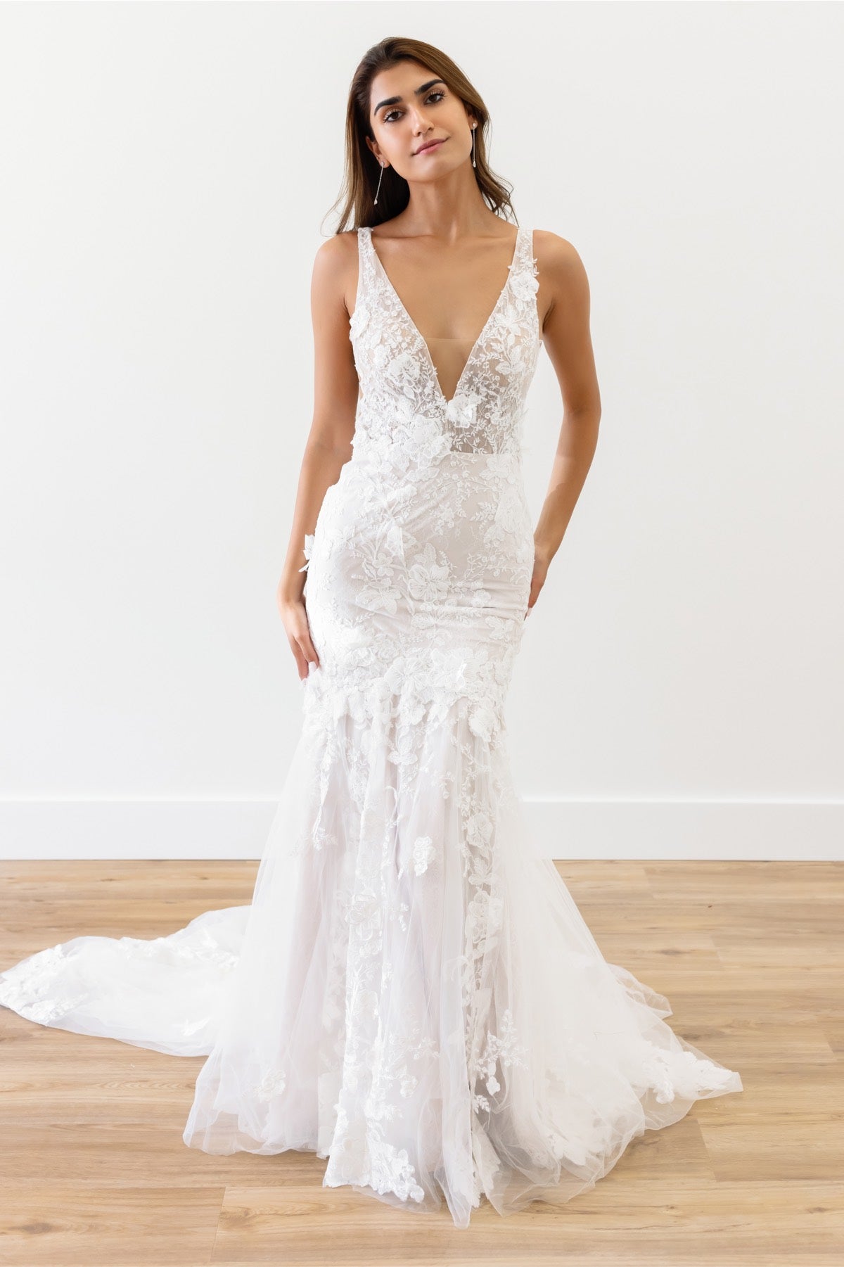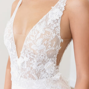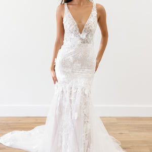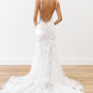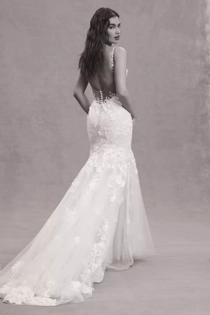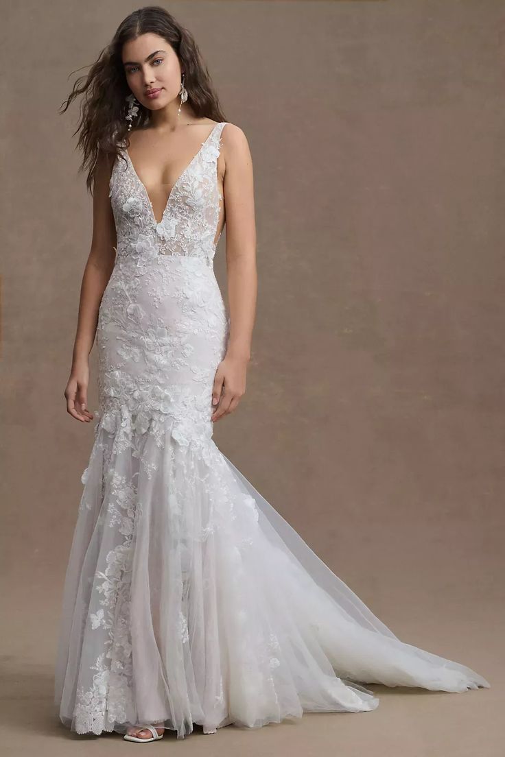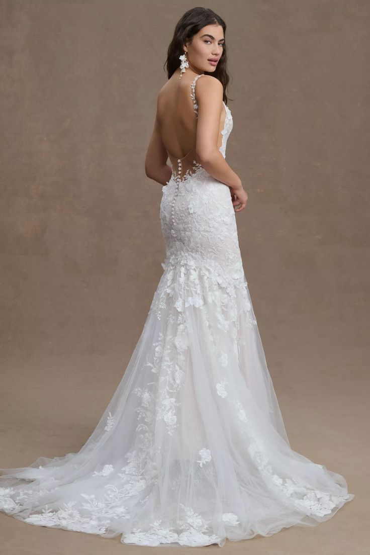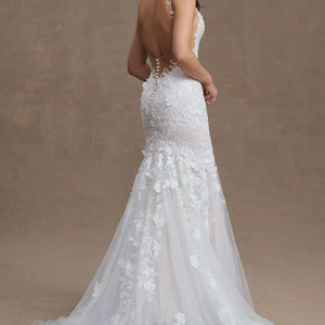 Adorned with 3D floral details, the bold-yet-elegant Elora Mermaid Gown is sure to turn heads with its intricate design and gorgeous lace back. Style number: 10710.
